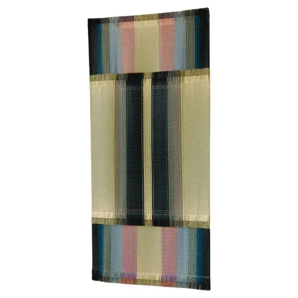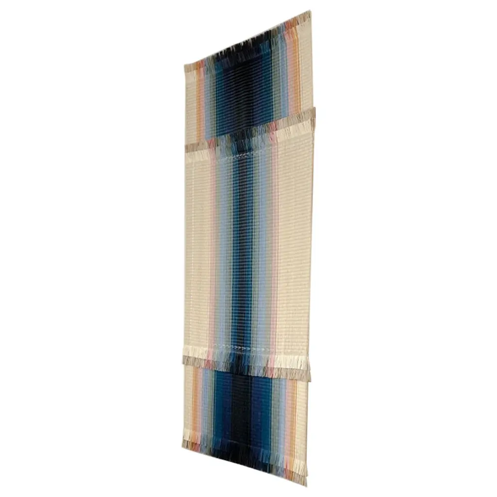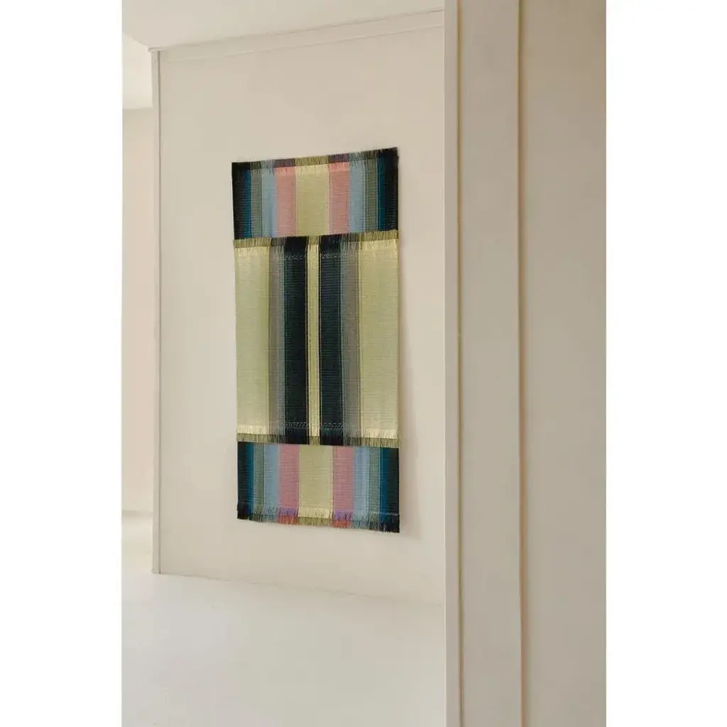 Ishoku Perspective 03 by Mae Engelgeer Limited edition of 5. Dimensions: D 0,5 x W 90 x H 190 cm. Materials: Igusa straw. Ishoku perspective wall panels. Graphic compositions made by colores igusa straw creating perspectives. Inspired by the first tatami floor mats used in Japan for tea ceremonies. Woven in Japan in colaboration with Mitsuru Yokoyama and hand finished in Amsterdam.