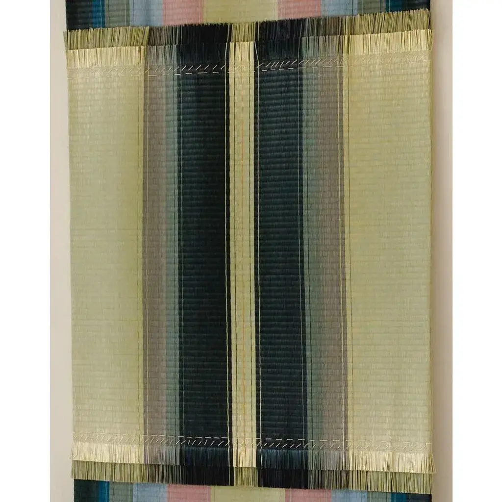 Ishoku Perspective 03 by Mae Engelgeer Limited edition of 5. Dimensions: D 0.5 x W 90 x H 190 cm. Materials: Igusa straw. Ishoku perspective wall panels. Graphic compositions made by colores igusa straw creating perspectives. Inspired by the first tatami floor mats used in Japan for tea ceremonies. Woven in Japan in colaboration with Mitsuru Yokoyama and hand finished in Amsterdam.
