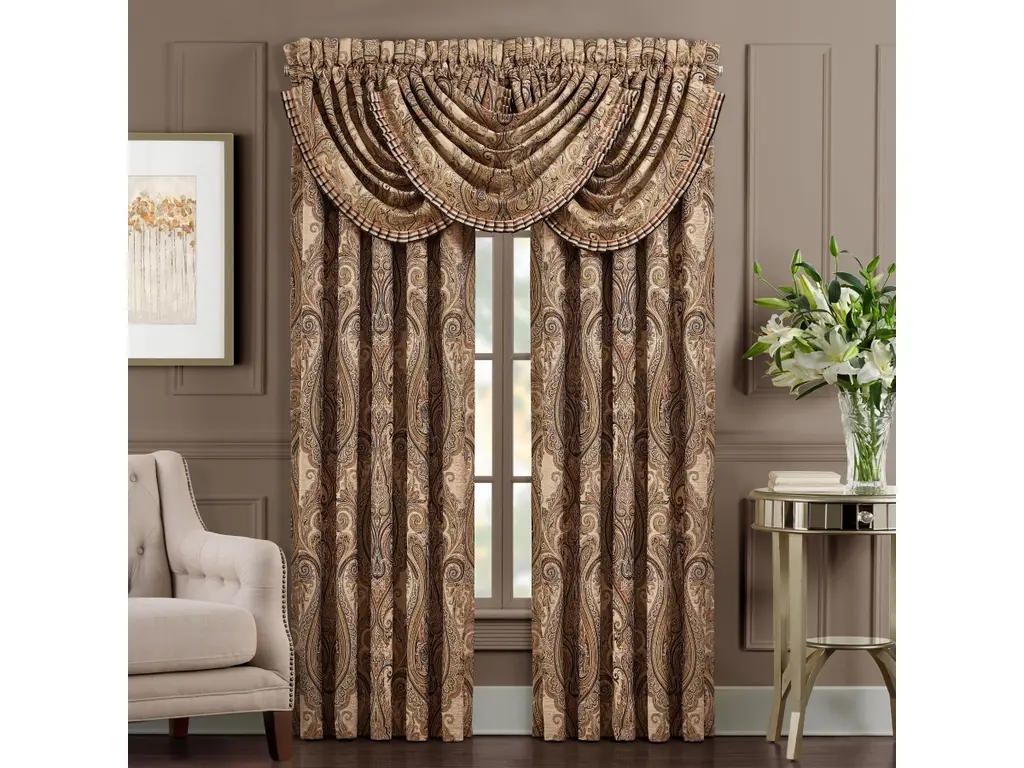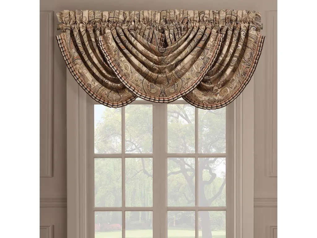 Evoking a mood of bygone elegance, the J. Queen New York Luciana - Beige Window Waterfall Valance brings the past beautifully into the present. Sure to add a decorator touch to your home, this jacquard patterned window valance with waterfall draping and beaded tassel fringe is crafted with care for the upscale aesthetic you desire.
