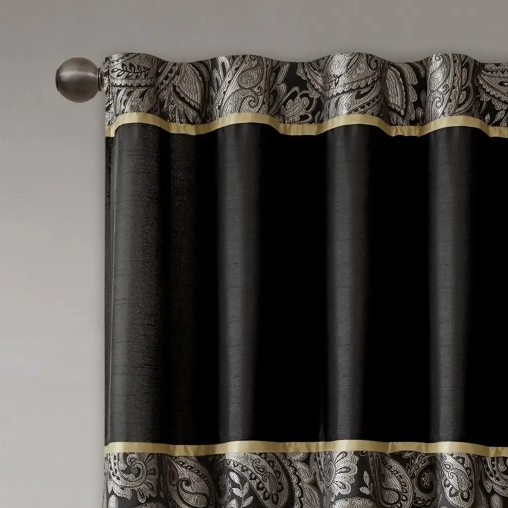 For a luxuriously classic style, our Madison Park Aubrey Window Curtain Pair is the perfect touch to your decor. The alluring jacquard weave is inspired from an updated paisley motif and is woven in beautiful hues of black, gold, and a hint of platinum for a shimmering accent. The window panels are pieced with solid faux silk and beautiful flat piping details in gold, creating an elegant look. While also achieving the OEKO-TEX certification, meaning it does not contain any harmful substances or chemicals, ensuring quality comfort and wellness. Rod pocket or back tabs top finish makes this curtain easy to hang, open, and close panels throughout the day; while fitting up to a standard 1.25" diameter rod. Coordinating bedding is also available and sold separately. Product Details 50x84" 2 Window Panels:50"W x 84"L (2) Material 100% polyester, rod pocket and back tabs