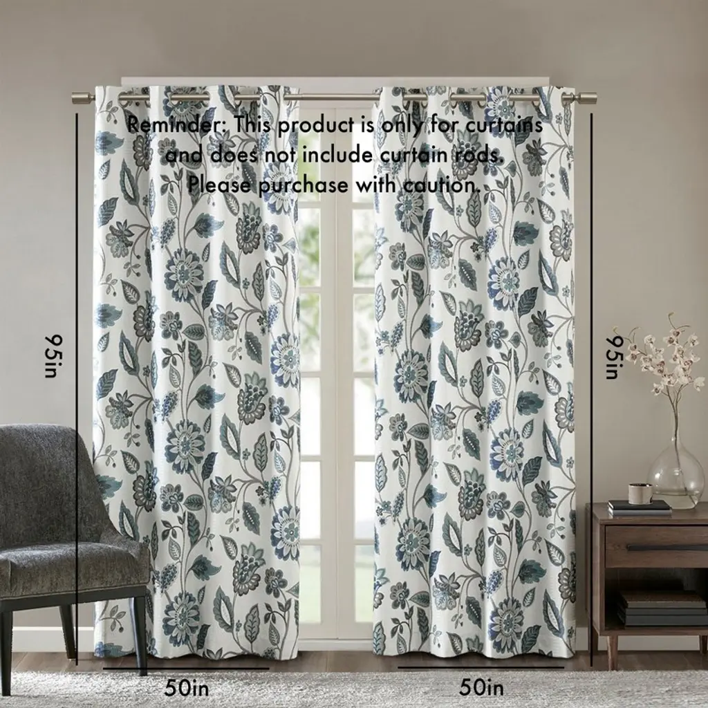 Description Beautifully frame your window with the stylish and functional SunSmart Camille Printed Room Darkening Curtain. A floral design in deep aqua, silver, and taupe hues is printed on a white dobby jacquard fabric creating texture and sheen for beautiful dimension and charm. Featuring a one pass foamback finish, this window panel provides a room darkening effect to soften harsh sunlight, while also serving as an effective barrier to dampen outside noise. In addition, this window panel is also OEKO-TEX certified, meaning it does not contain any harmful substances or chemicals, ensuring quality comfort and wellness. Silver grommets at the top make it easy to hang, open, and close throughout the day; fits up to a 1.25" diameter rod. Offering a moderate level of added privacy with nominal energy savings, this room darkening window panel brings a casual update to your home while creating a low ambiance lighting level, perfect for dining rooms, living rooms, or hallways. Product Details 50x95" 1 Window Panel:50"W x 95"L Material 100% Polyester, 1 pass foamback finish