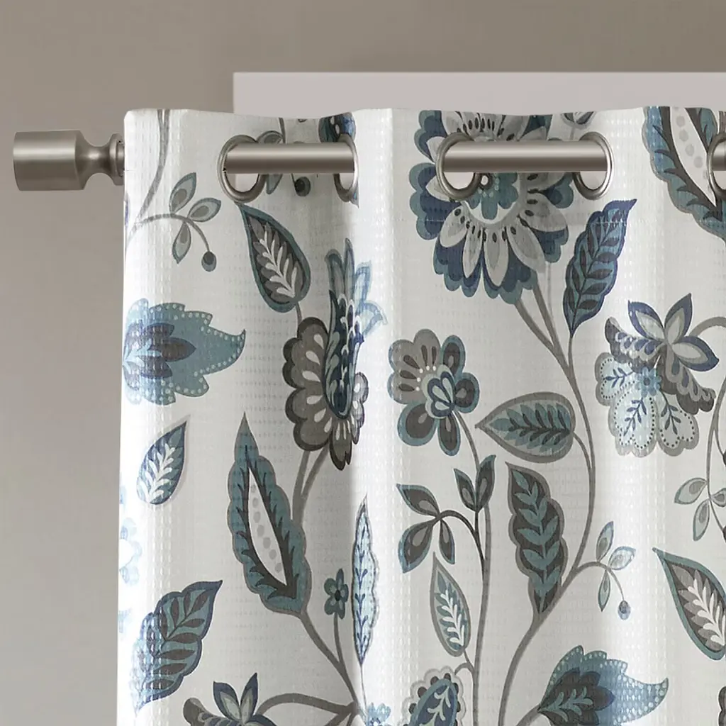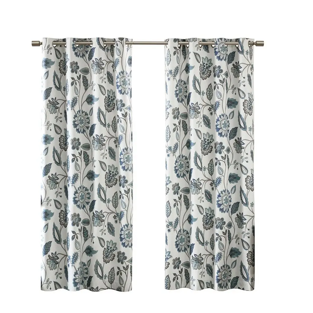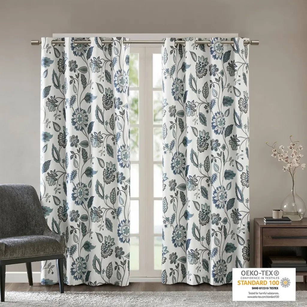 Description Beautifully frame your window with the stylish and functional SunSmart Camille Printed Room Darkening Curtain. A floral design in deep aqua, silver, and taupe hues is printed on a white dobby jacquard fabric creating texture and sheen for beautiful dimension and charm. Featuring a one pass foamback finish, this window panel provides a room darkening effect to soften harsh sunlight, while also serving as an effective barrier to dampen outside noise. In addition, this window panel is also OEKO-TEX certified, meaning it does not contain any harmful substances or chemicals, ensuring quality comfort and wellness. Silver grommets at the top make it easy to hang, open, and close throughout the day; fits up to a 1.25in diameter rod. Offering a moderate level of added privacy with nominal energy savings, this room darkening window panel brings a casual update to your home while creating a low ambiance lighting level, perfect for dining rooms, living rooms, or hallways. Product Details 50x95in 1 Window Panel:50inW x 95inL Material 100% Polyester, 1 pass foamback finish