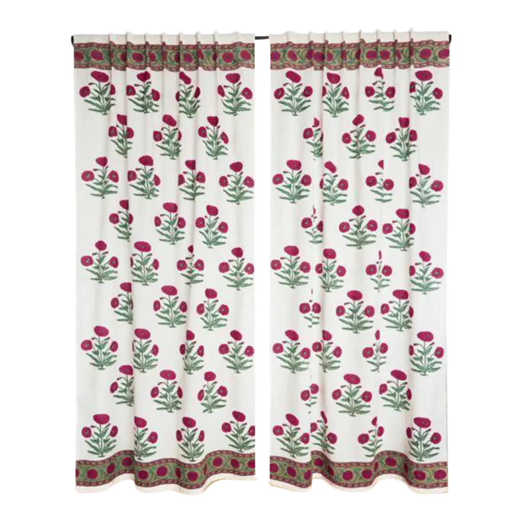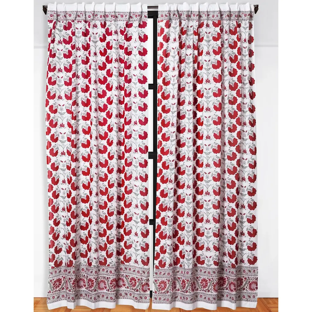 With an exuberant all-over flower pattern, the Janvi design presents a modern take on traditional, nature-inspired motifs. A beautifully detailed border makes for a striking finish. Made from semi-transparent white cotton voile, our block printed curtains make a gentle veil for your windows that offers both privacy and light. Hand-printed using woodblock printing techniques that produce subtle variations in design, these panels illustrate classic Indian and nature-inspired motifs that suggest casual, organic elegance. Our all-natural curtains create a calming gateway between inside and out—helping you to relax the minute you get home. Materials: Cotton voile. Crafts: Hand block printing. DIMENSIONS 45" wide x 96" long CARE & MAINTENANCE Protect from direct sunlight when using. Hand or machine wash separately in cold water on gentle cycle. Use a mild detergent without any bleach or fabric softeners. Do not soak or wring the fabrics. Scrub gently if needed. Tumble dry on low heat or air dry in the shade. Iron at medium setting. Test stain remover on a small area before applying.