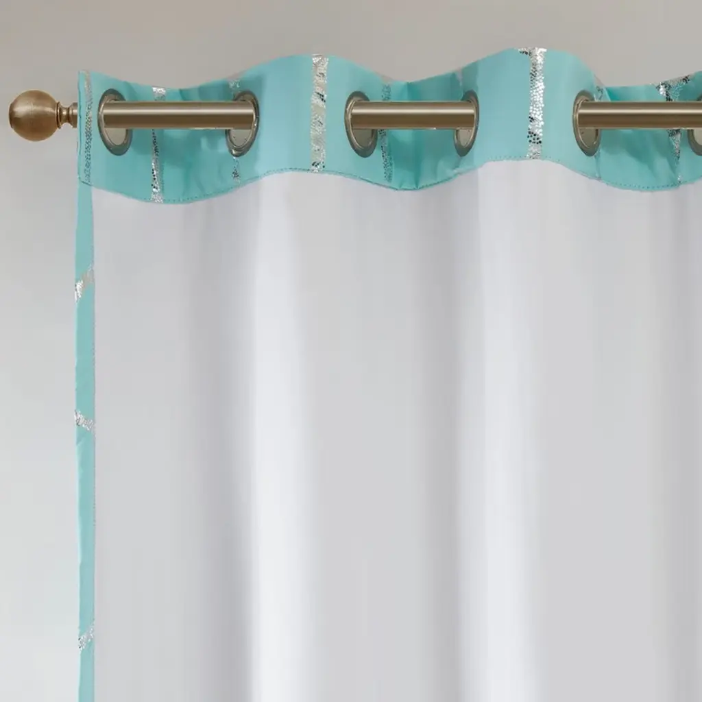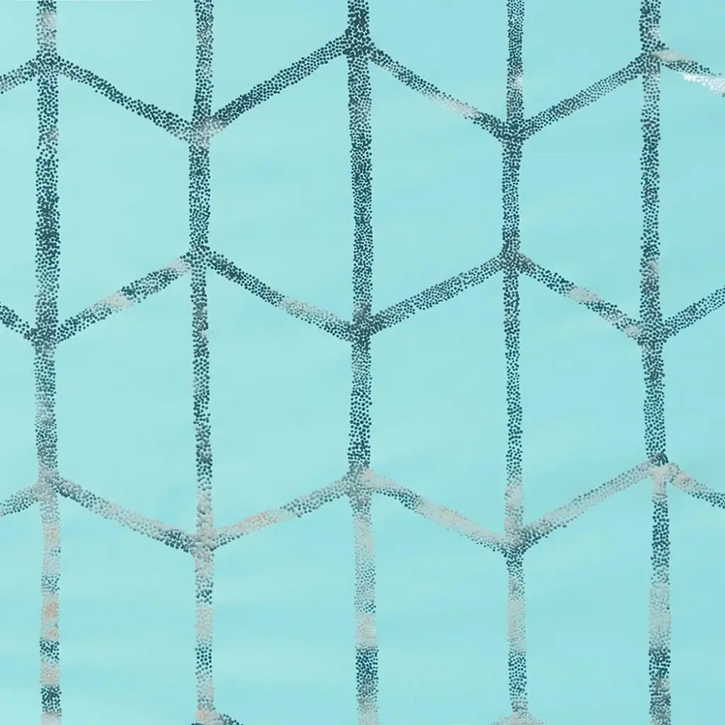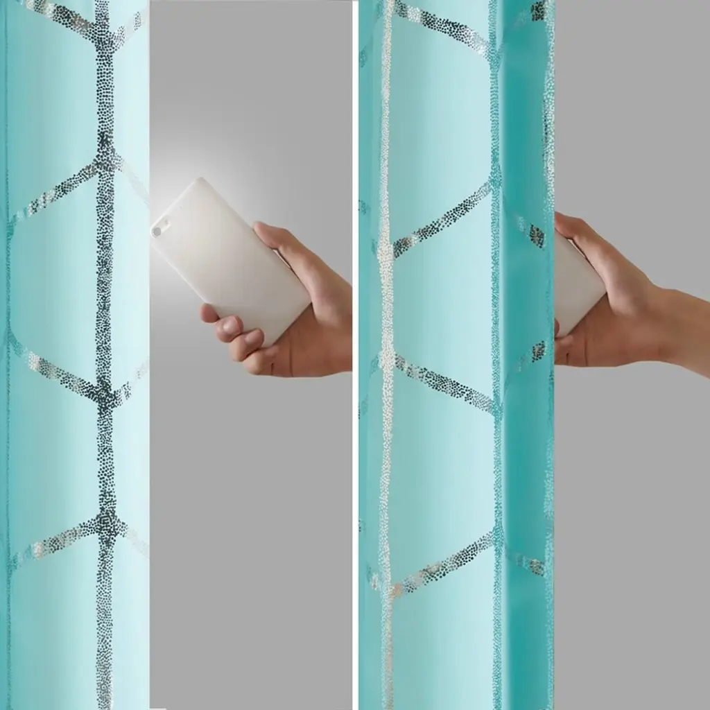 Add a bold touch of style and functionality to your space with this metallic geometric total blackout curtain panel. Featuring a striking silver print over a vibrant aqua background, this curtain brings a playful yet modern accent to your room. Crafted from soft microfiber with a 3-pass foam back lining, it offers 100% total blackout, effectively blocking sunlight and external light for optimal privacy. The heavy construction also improves energy efficiency and helps reduce outside noise. Designed with an antique silver grommet top, this panel fits rods up to 1.25 inches in diameter and ensures smooth opening and closing. Each panel measures 50 inches wide by 84 inches long—use two for standard window coverage. Machine washable for easy maintenance and long-lasting use.
