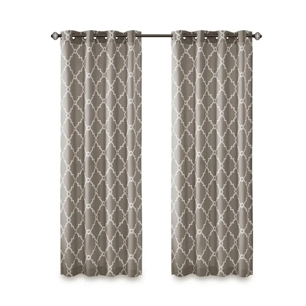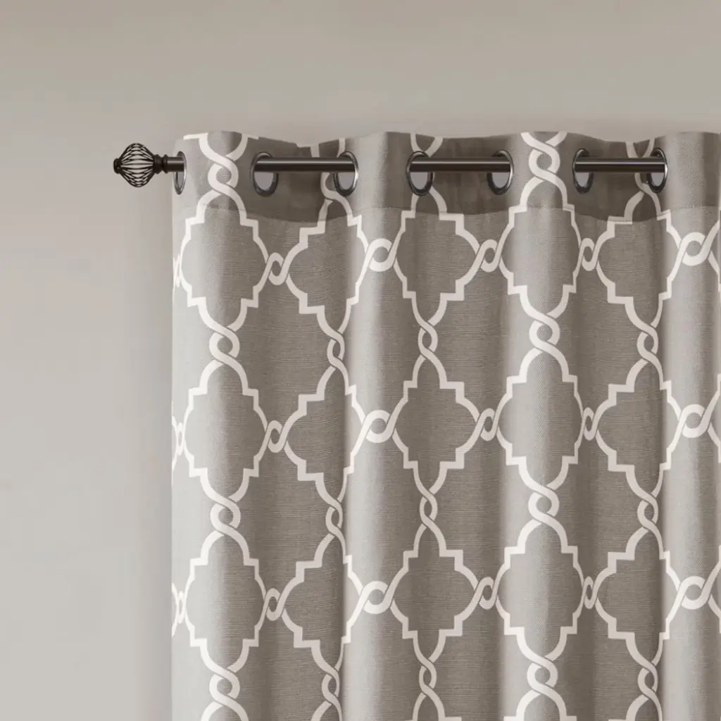 Add a touch of modern flair to your space with this openwork print curtain. A soft geometric scroll print accents the bottom, adding a touch of sophisticated elegance to any room. The basket-weave cotton blend fabric is rich and softly filters sunlight while providing privacy. The bronze-tone grommet at the top accepts curtain rods up to 1.25 inches in diameter for easy hanging and sliding. The single panel measures 50 inches wide, making it ideal for pairing and providing standard coverage. Due to the free-form cut of the fabric, pattern placement may vary. This machine-washable curtain combines practicality with aesthetics.