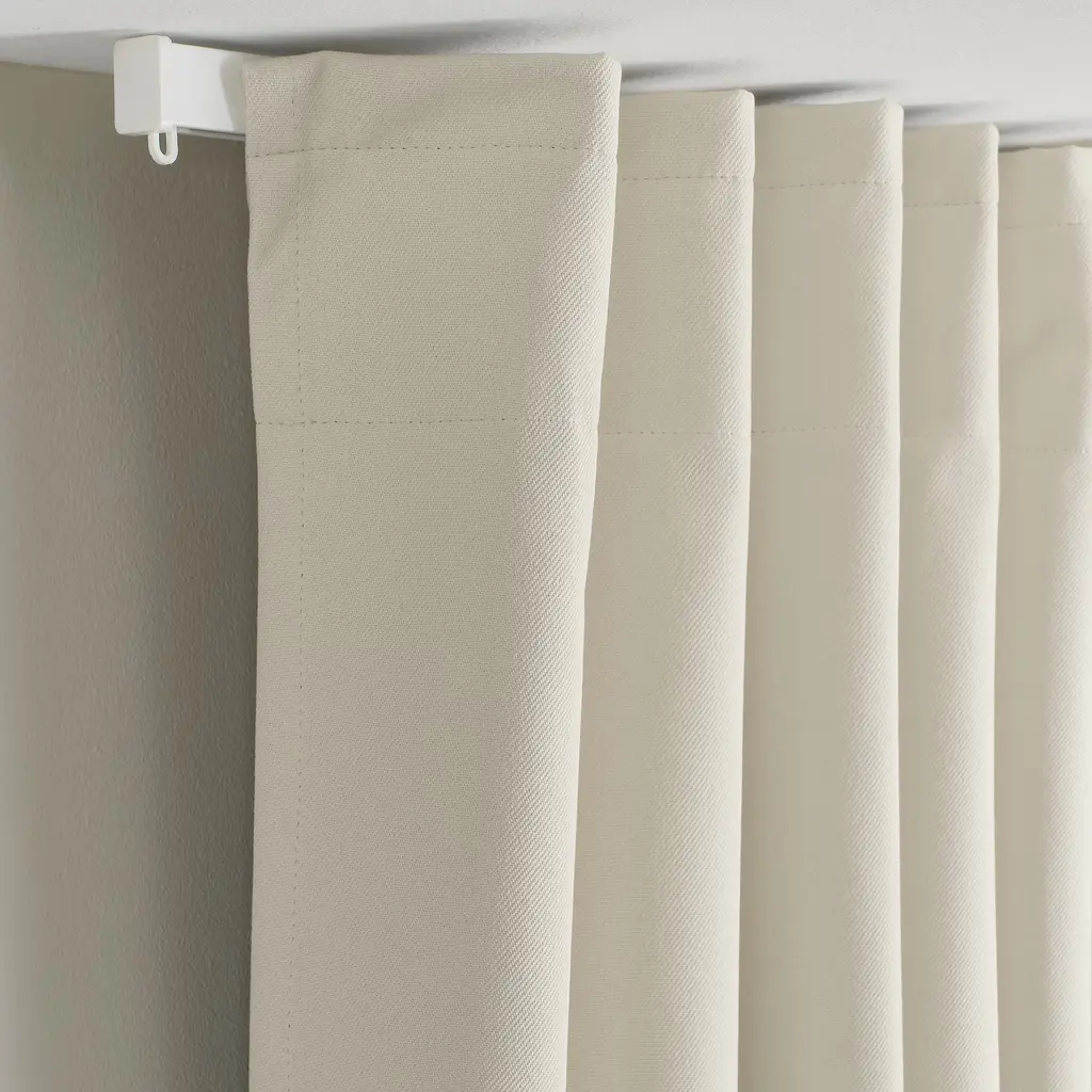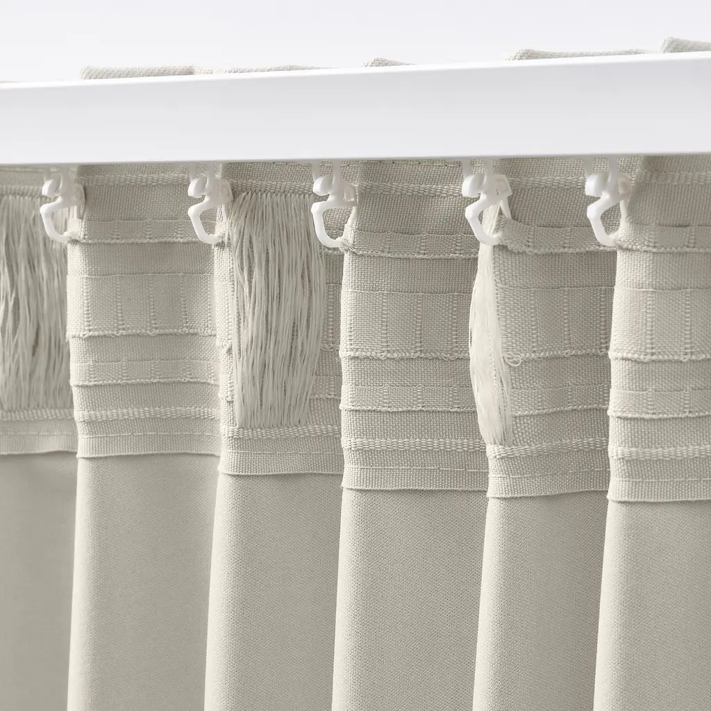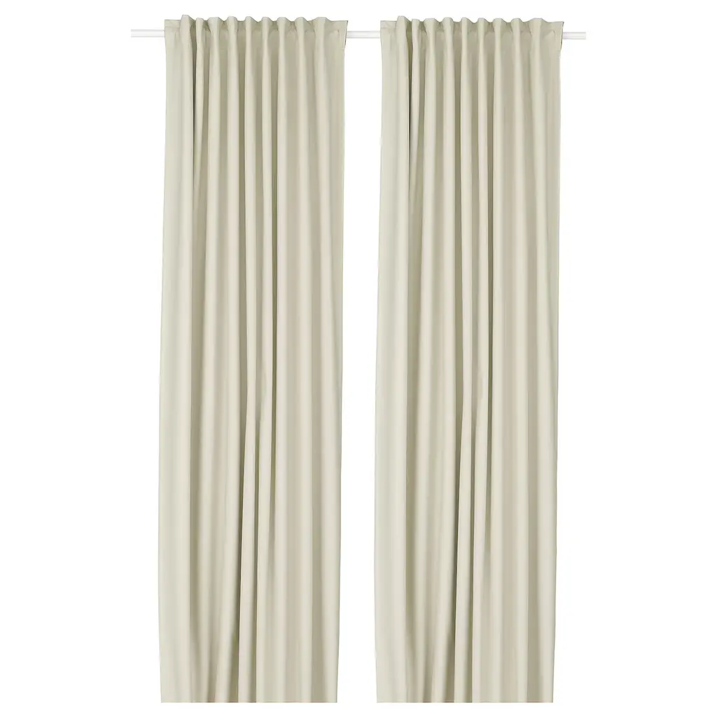 KORGMOTT Black-out curtains, 1 pair - beige/with heading tape 57x98 ". The fabric blocks out all light and glare on TV/screens. It gives complete privacy as shapes or light cannot be perceived from outside and the transition between day/night cannot be distinguished Curtains, 1 pair included