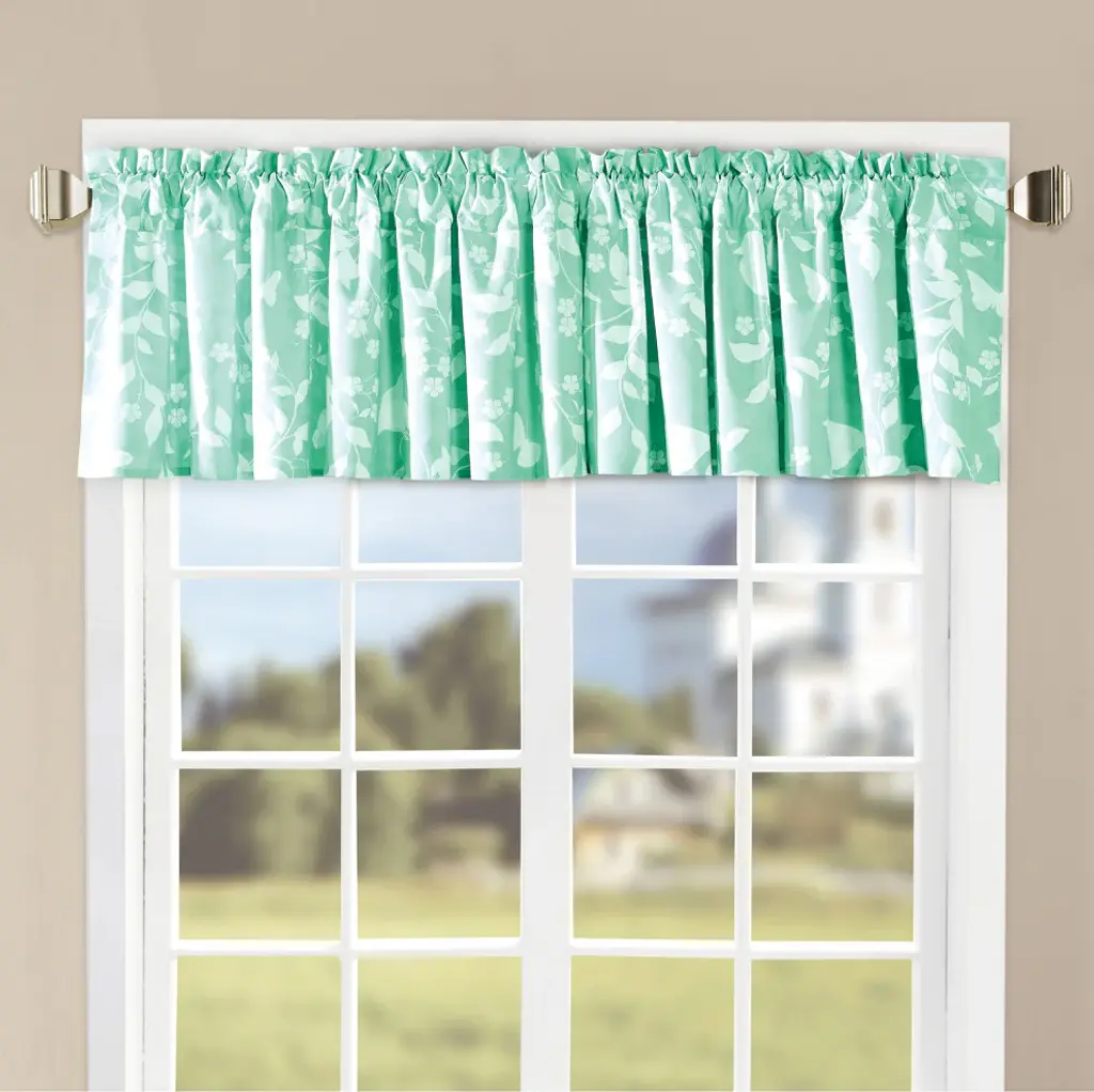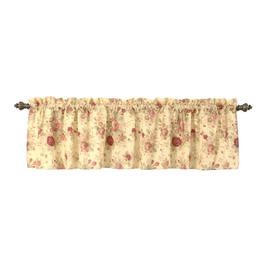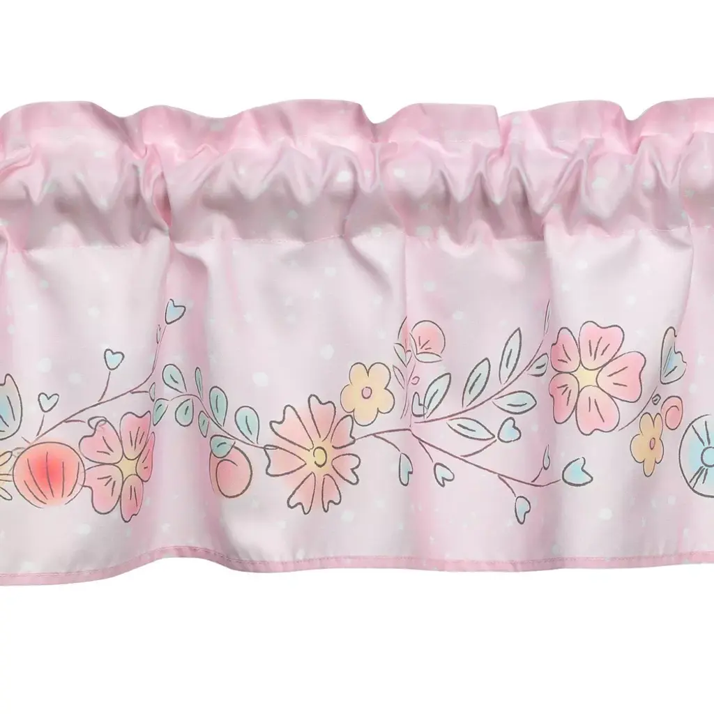 On a pretty pink ground with tossed white stars and a floral garland this window valance will add a sweet finishing touch to your little princess’s room. It is 54” long and 10” high with a 2 ½” wide rod pocket. It is made in a soft microfiber material. Machine washable for easy care.