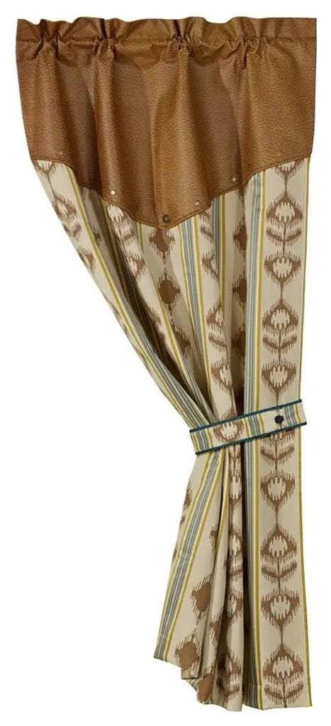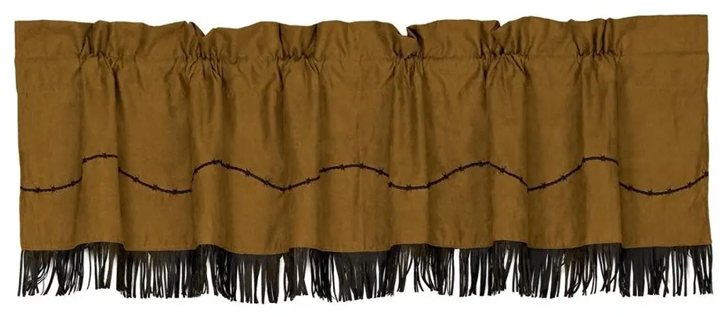 The Laredo coordinating valance consists of a tan faux suede fabric accented with an embroidered star design and coordinating fringe along the finished hem.