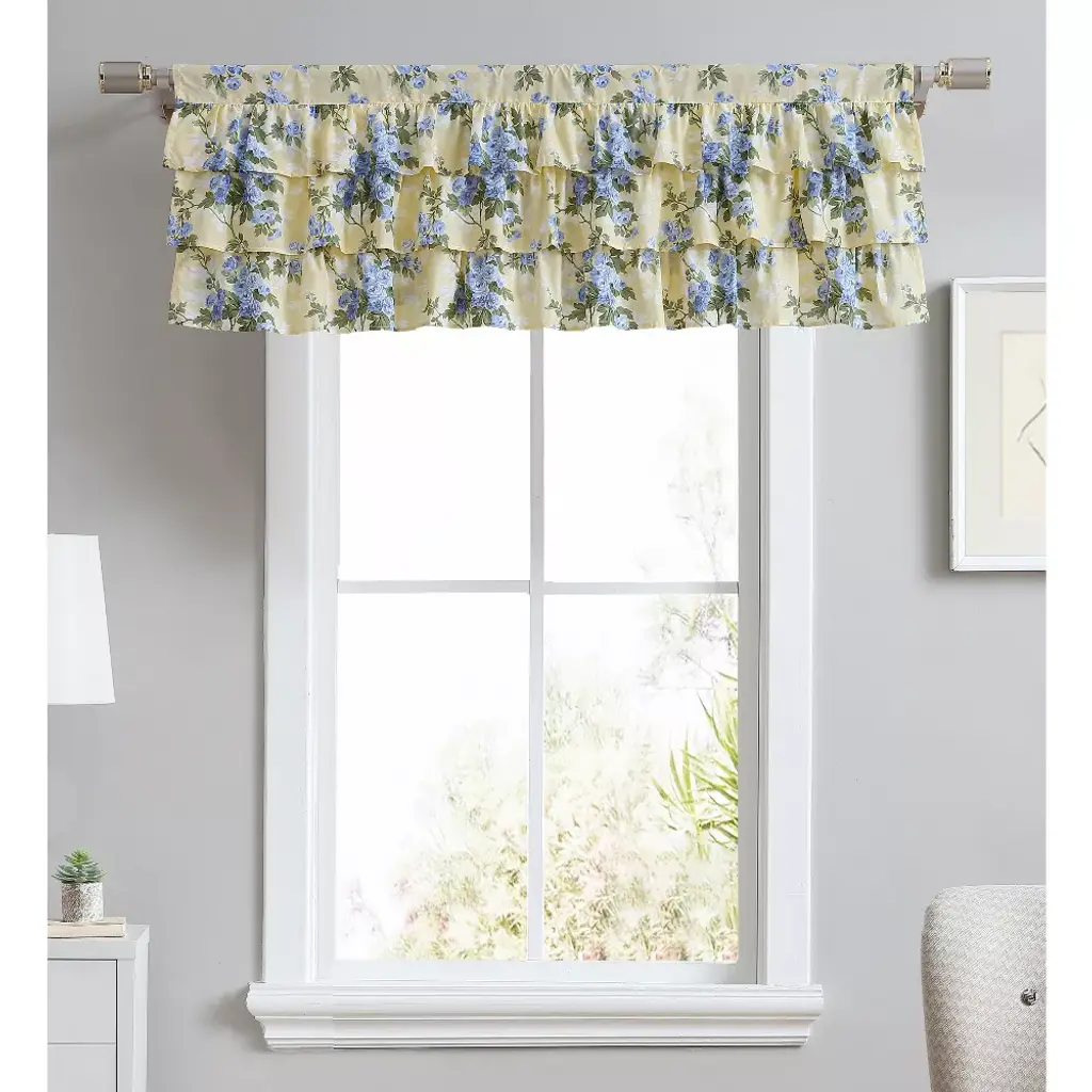 A sunny buttercup yellow background is the perfect showcase for these romantic delft blue roses straight from an english country garden. A pale damask shadow effect in the background adds additional depth and interest to this lovely print. The blue and white plaid reverse appears on the European shams and a ruffled accent pillow as well as trimming a second floral pillow adding a final note of country charm to complete the ensemble.