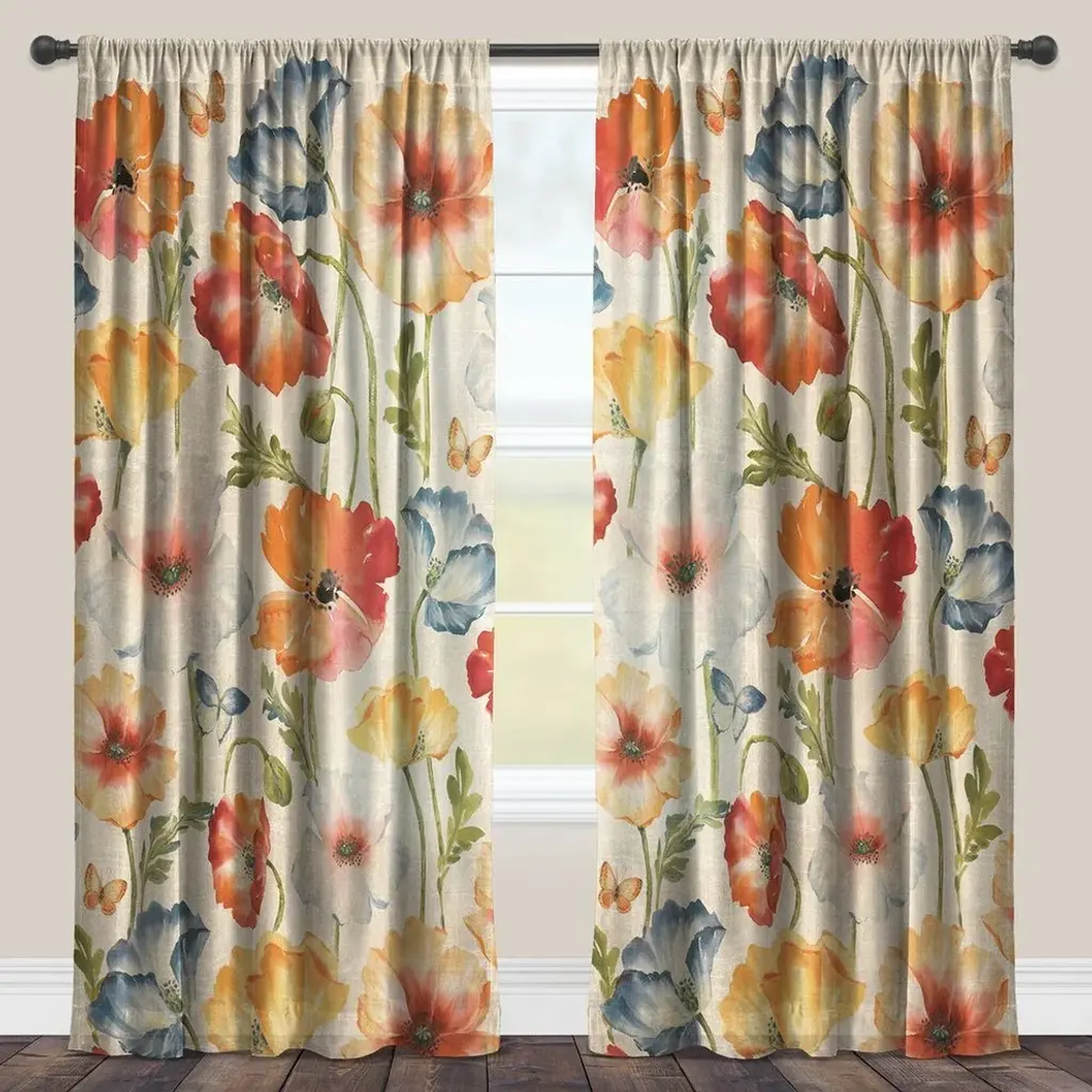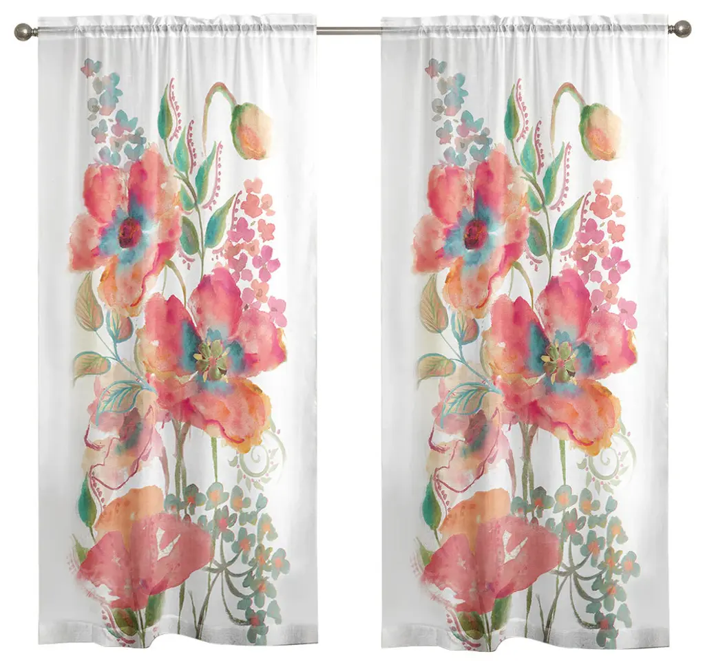 Energize your home with the fresh watercolor floral design of Laural Home''s "Multi Watercolor Poppies" sheer window curtain. These beautiful poppies are set against a textured, linen-like background and will enhance any decor. Light gently filters through this sheer, art-inspired window curtain while adding style and elegance to your home.All our products are digitally printed to create crisp, vibrant colors and images. Imported.- 100% polyester- 3" rod pocket- Machine washable- Curtains sold individually- Sizes:84" x 50"95" x 50"