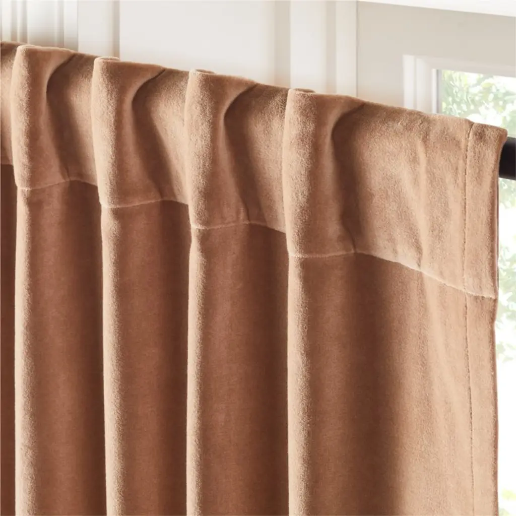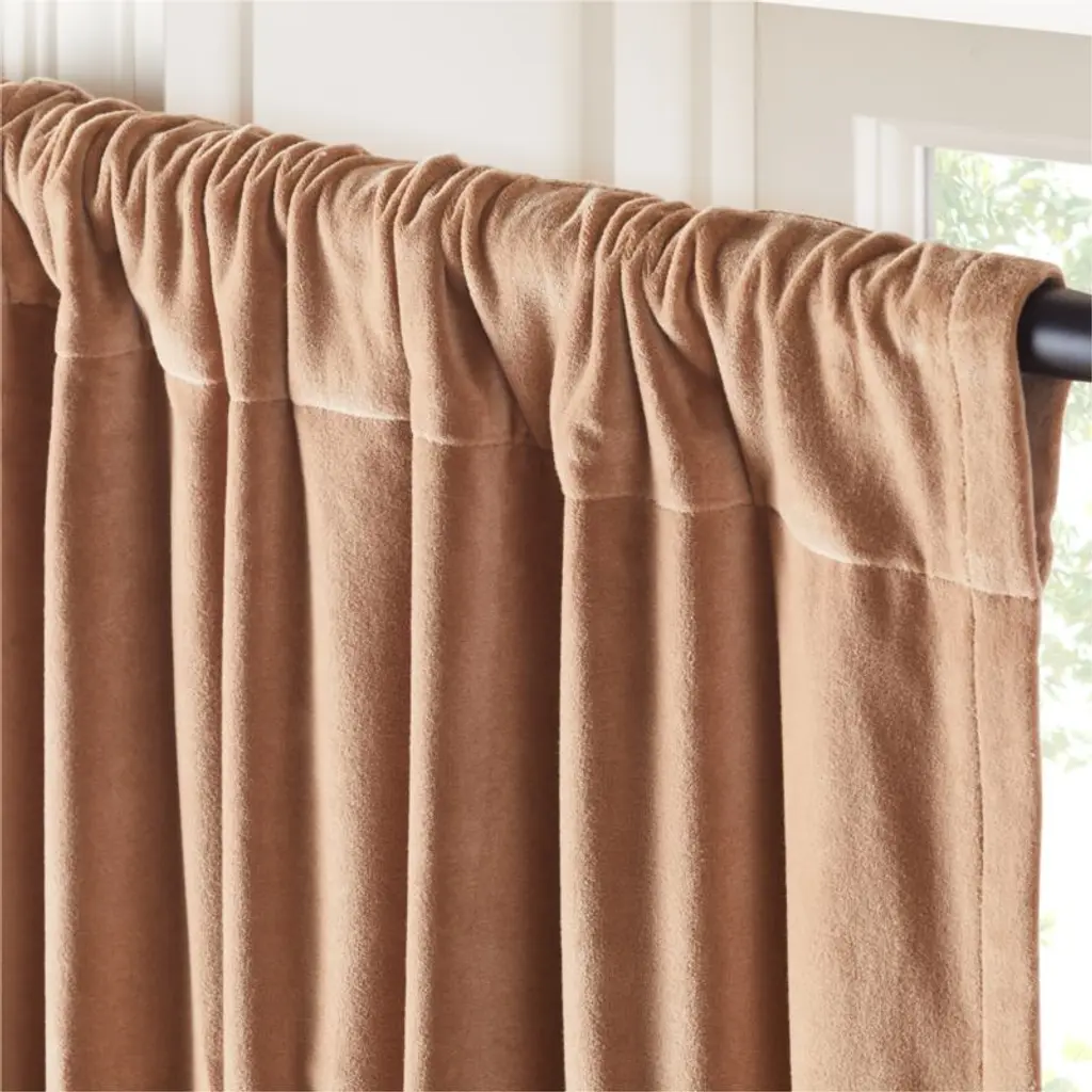 Lush organic cotton velvet frames windows in luxurious warmth. Rich in texture and beauty, light brown velvet curtain panel reduces sound and darkens the room. Hangs beautifully with back tabs, rod pocket or drapery hooks. CB2 exclusive.