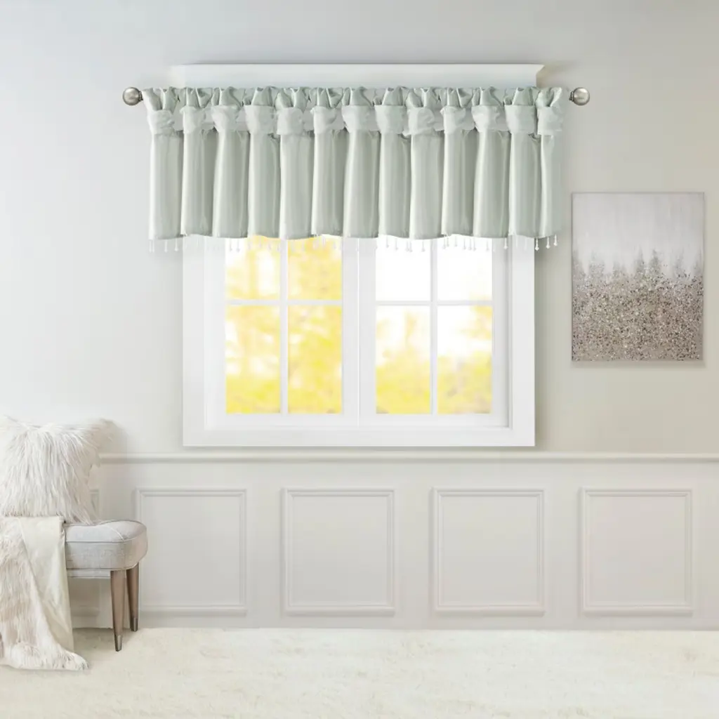 Description Give your home a decorator¡¯s touch with the Madison Park Emilia Window Valance. Made from a faux silk fabric, this elegant window valance features a DIY twist tab top finish that creates rich deep folds, combined with a beautiful bead trim for an alluring charm. Added lining offers more privacy and a fuller appearance, while the luxurious sheen and rich pewter tone provides a touch of sophistication to your decor. Easy to hang, this tab top valance updates any decor into subtle glamour. Hanging instructions are included. Fits up to a 2in diameter rod. Product Details 50x26in 1 Valance:50inW x 26inL Material Material: Faux Silk Liner: Microfiber