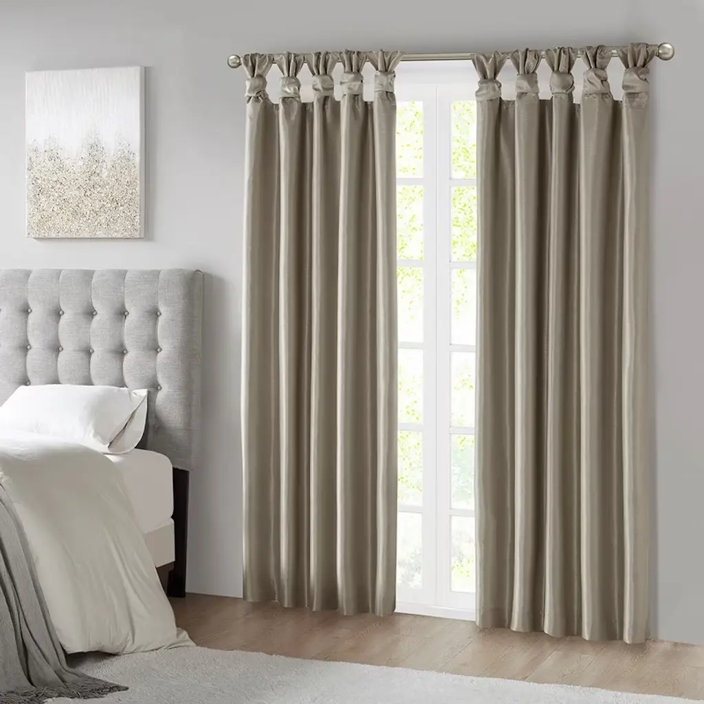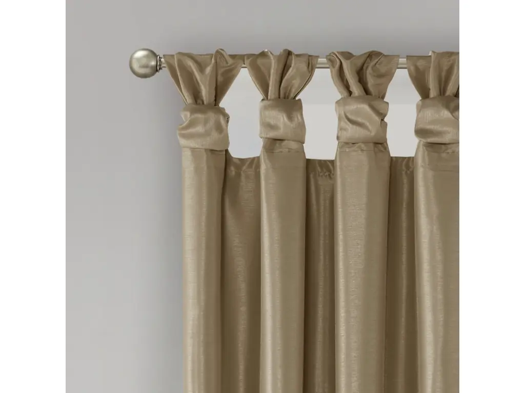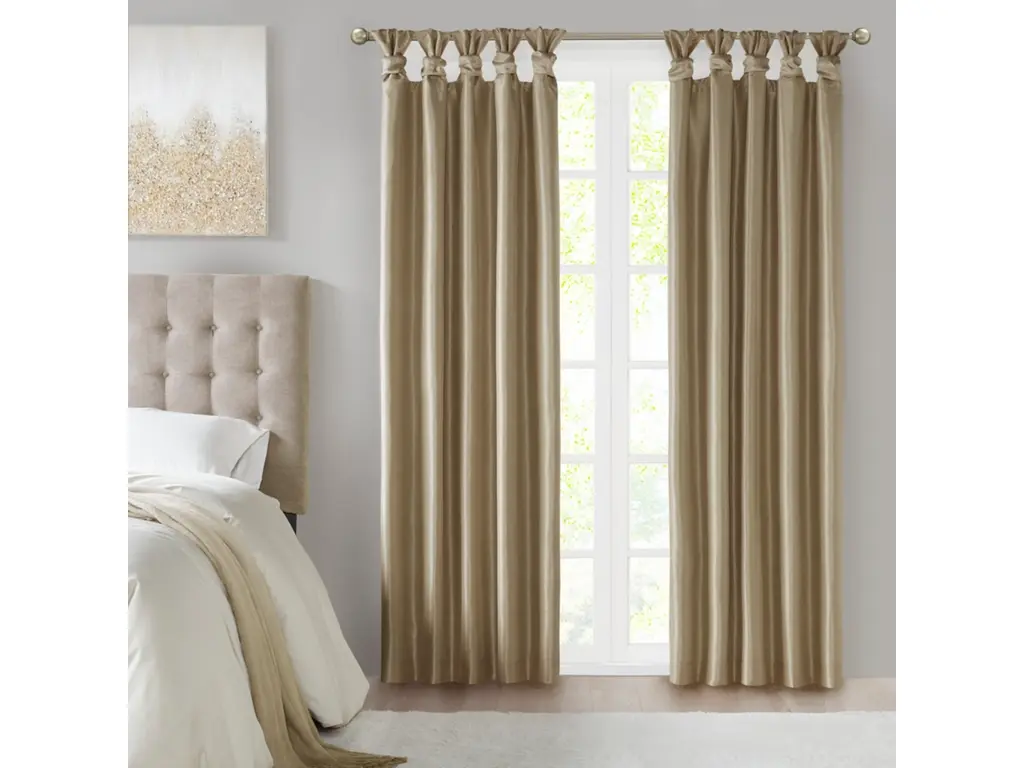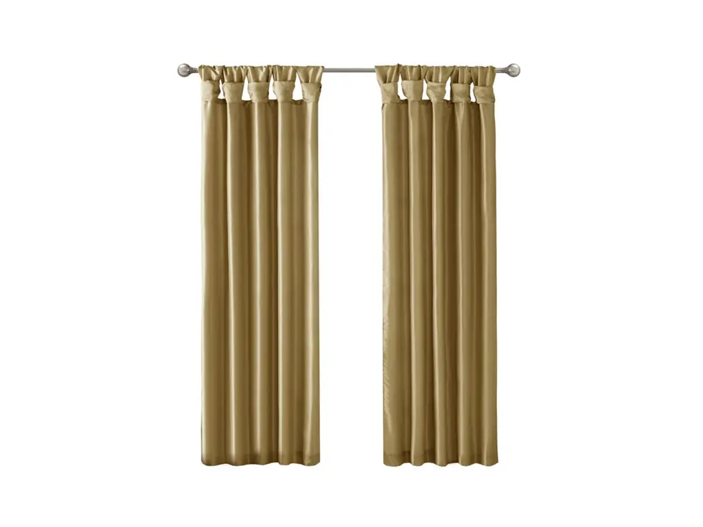 Energy efficiency meets a sophisticate style with the Madison Park Emilia Twist Tab Total Blackout Window Curtain. This bronze window curtain panel showcases a DIY twist tab top finish that allows you to create an elegant display in your living room or bedroom space. The faux silk sheen base fabric features a 3 pass foamback liner on the reverse to block out all outside light, noise, and intrusion ensuring the highest level of privacy. Using thermal technology, the total blackout curtain helps provide maximum energy savings by keeping your room the perfect temperature through the seasons. While this window panel is also OEKO-TEX certified, meaning it does not contain any harmful substances or chemicals, ensuring quality comfort and wellness. This twist tab total blackout window panel is perfect for use in bedrooms, media rooms, or any private space. As shown in the image, two curtain panels need to be purchased for each window; Fits up to a 2" diameter rod.