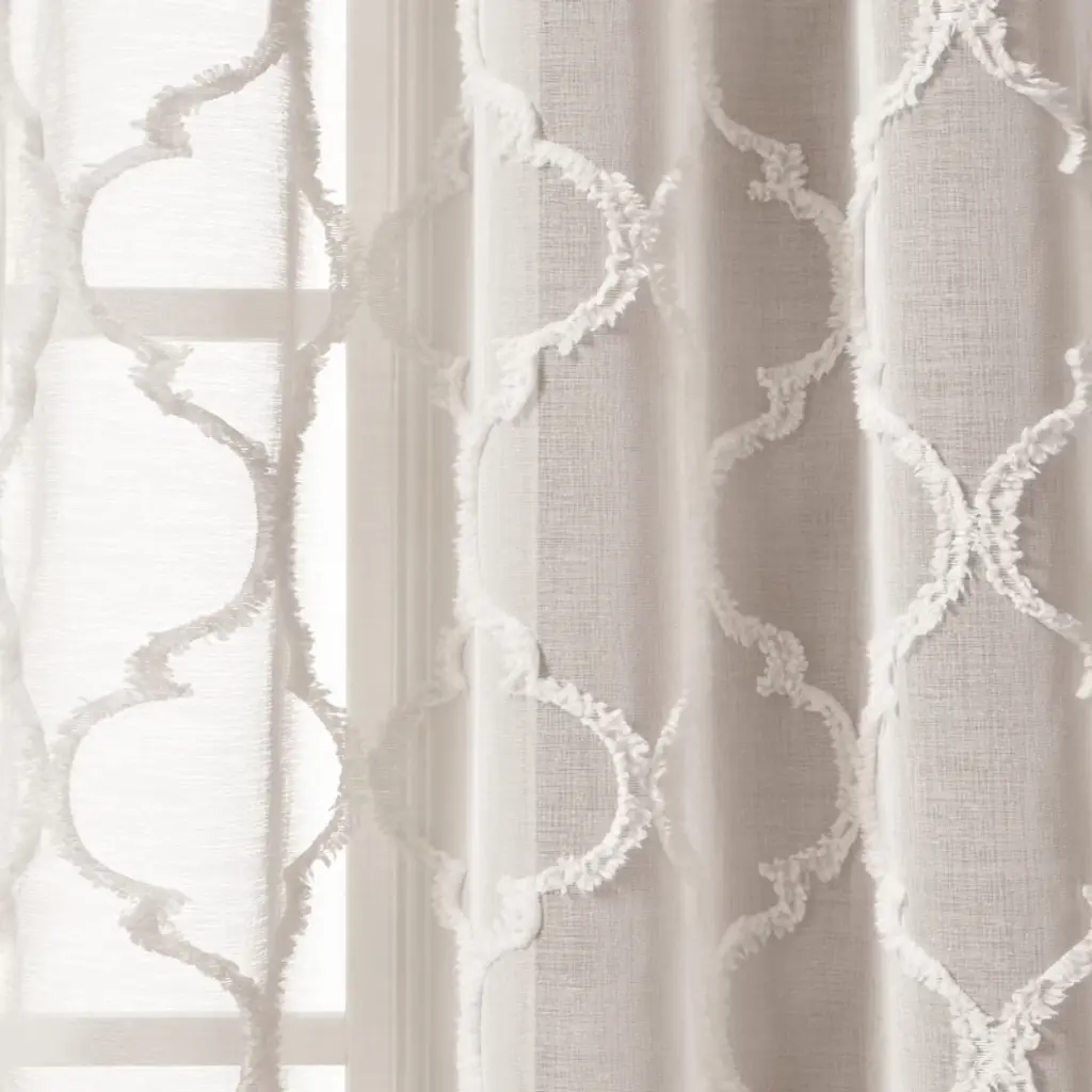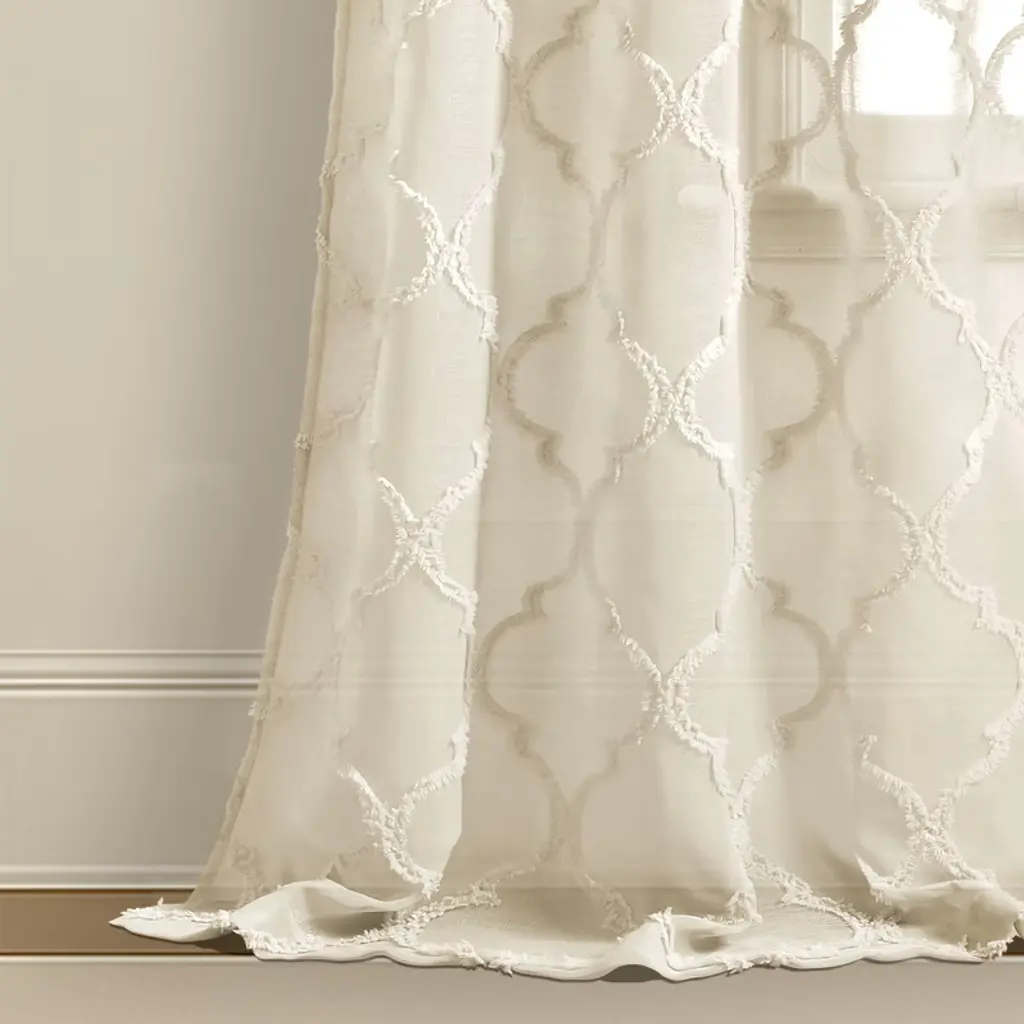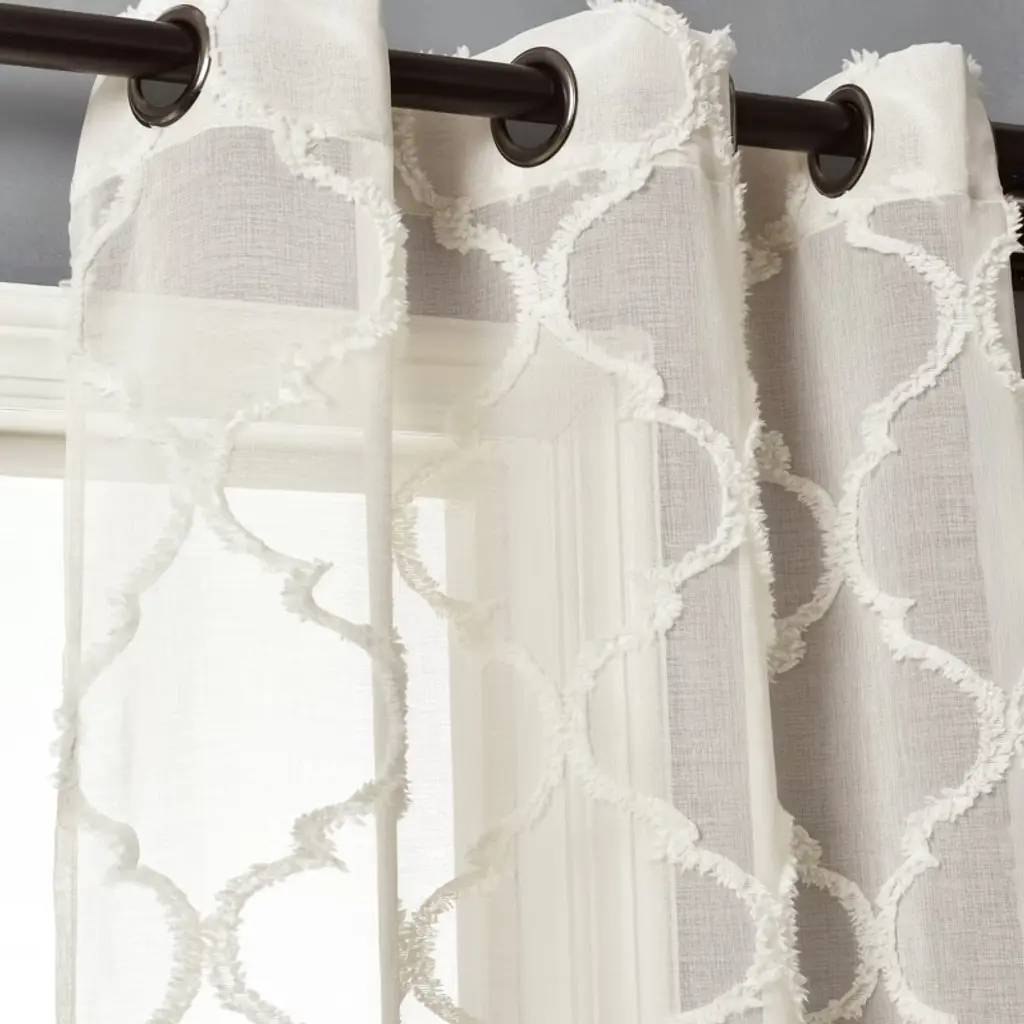 Bring soft texture and timeless charm to your space with the Lush Decor Garden Trellis Grommet Sheer Window Curtains. Featuring tufting details in a classic trellis pattern, these sheer curtains add dimension to your country, cottage core, or modern farmhouse style home. These grommet curtains for living room let in plenty of light while maintaining privacy. Sold as a set of 2 panels, each measuring 38 inches wide with multiple length options. These farmhouse curtains allow easy installation with 1.65" diameter metal grommets. To care for these trellis curtains hand wash separately in cold water and hang to dry. Do not wring, use a steamer if needed.