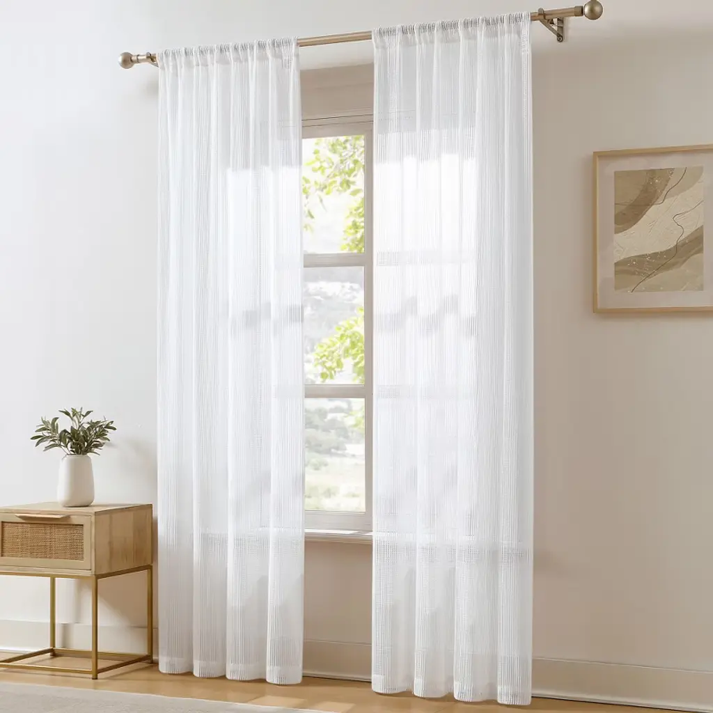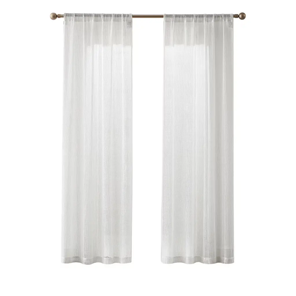 This Milla Knitted Texture Sheer Window Curtain Panel Set is the perfect window decor for anyone wanting to add style around their outdoor view. The very sheer fabric adds texture while letting in plenty of sunlight into your home. The simple stripe pattern and subtle texture of these knitted curtains are perfect for a modern farmhouse styled home. They can add a homey touch to your dining room or living space. You have endless options when styling these sheer curtains! Enjoy a well lit room when you hang this sheer curtain set by itself or pair them with your favorite decorative curtains for a chic layered look. Increase the privacy of your home by adding a set of room darkening panels to this look. This set includes two window curtain panels. Each panel in this pair measures 36 inches wide, giving you a total of 72 inches across. This sheer curtain set offers seamless installation with its 3" rod pocket, allowing you to easily slide it onto your curtain rod, or give the illusion of longer curtains, using clip rings (not included). This product is STANDARD 100 by OEKO-TEX® certified, which means the fabric, dyes and all components have been tested in an independent laboratory and certified against a list of more than 350 harmful substances. These panels are easy to maintain. Simply machine wash separately in cold water on the gentle cycle. Use only non-chlorine bleach if needed. Tumble dry low. Use an iron on low heat to remove wrinkles if needed.
