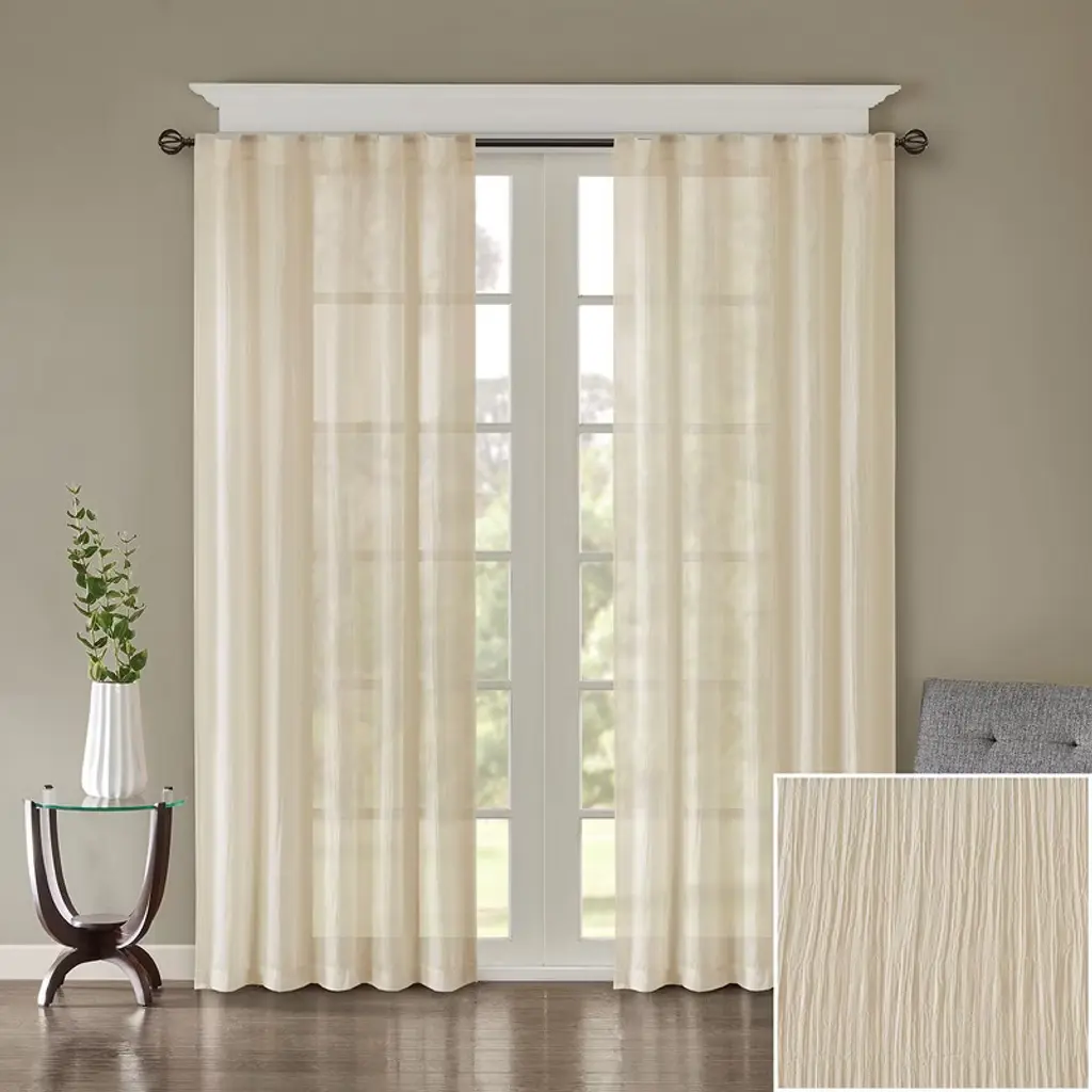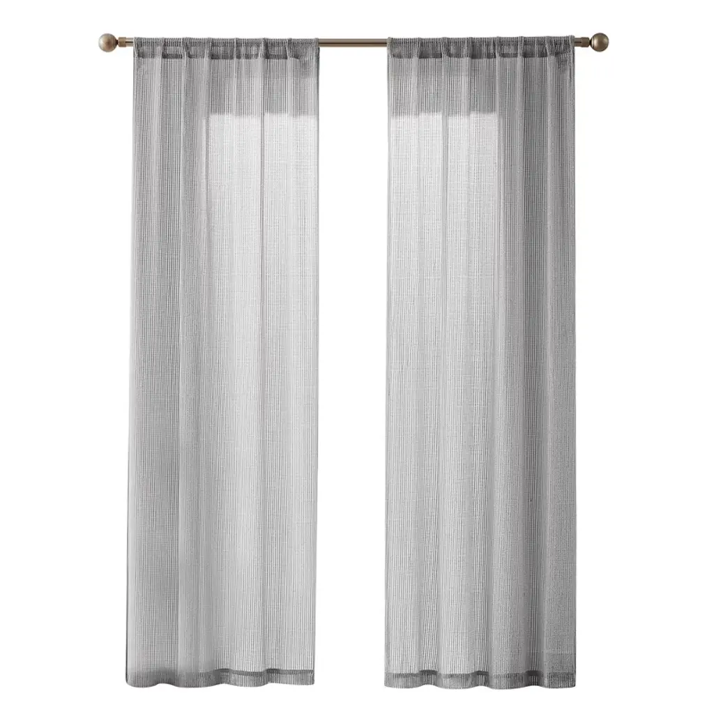 This Milla Knitted Texture Sheer Window Curtain Panel Set is the perfect window decor for anyone wanting to add style around their outdoor view. The very sheer fabric adds texture while letting in plenty of sunlight into your home. The simple stripe pattern and subtle texture of these knitted curtains are perfect for a modern farmhouse styled home. They can add a homey touch to your dining room or living space. You have endless options when styling these sheer curtains! Enjoy a well lit room when you hang this sheer curtain set by itself or pair them with your favorite decorative curtains for a chic layered look. Increase the privacy of your home by adding a set of room darkening panels to this look. This set includes two window curtain panels. Each panel in this pair measures 36 inches wide, giving you a total of 72 inches across. This sheer curtain set offers seamless installation with its 3" rod pocket, allowing you to easily slide it onto your curtain rod, or give the illusion of longer curtains, using clip rings (not included). This product is STANDARD 100 by OEKO-TEX® certified, which means the fabric, dyes and all components have been tested in an independent laboratory and certified against a list of more than 350 harmful substances. These panels are easy to maintain. Simply machine wash separately in cold water on the gentle cycle. Use only non-chlorine bleach if needed. Tumble dry low. Use an iron on low heat to remove wrinkles if needed.
