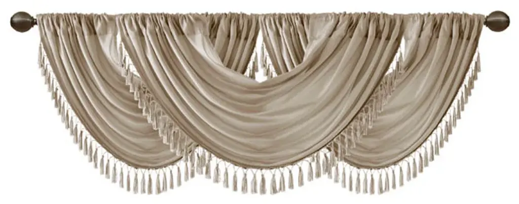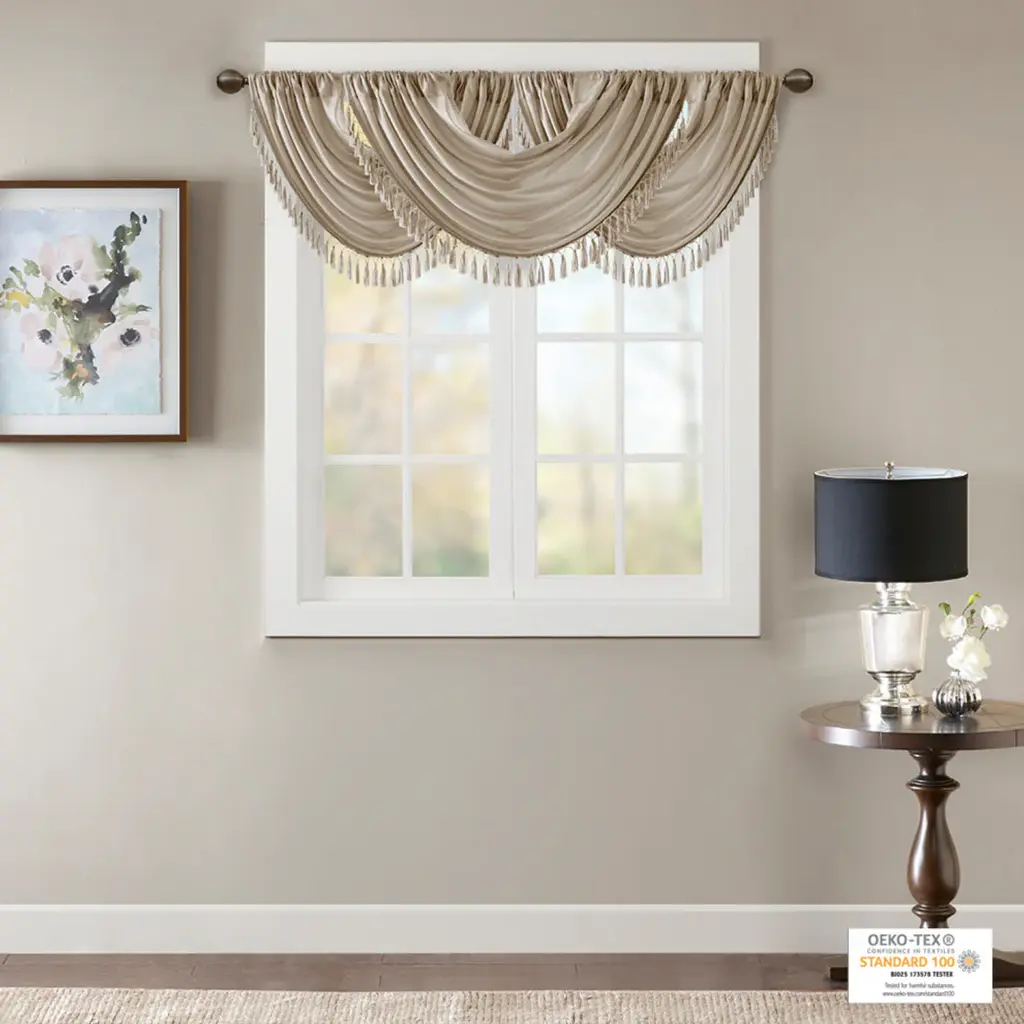 Bring style and sophistication to your windows, with our Elena Waterfall window valance. This classy champagne valance showcases rich center draping details and a beautiful tassel trim, combined with the faux silk fabric for a rich sheen and stylish update. Features added lining and a rod pocket top finish; fits up to 1.25" diameter rod. Part of our decorative valance collection, this valance is perfect as a stylish addition to any small window or even better as a layering piece to dress up any window panel. This window valance is also OEKO-TEX certified, meaning it does not contain any harmful substances or chemicals, ensuring quality comfort and wellness. Need to purchase 3 valances to create same look as image.38x46"1 Window Valance:38"W x 46"LMaterials:Faux Silk; 100% PolyesterMachine Washable