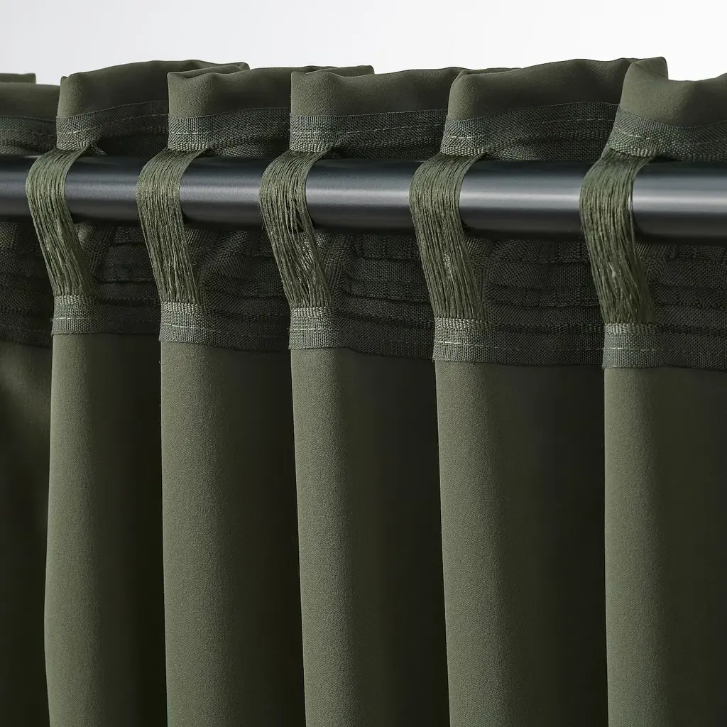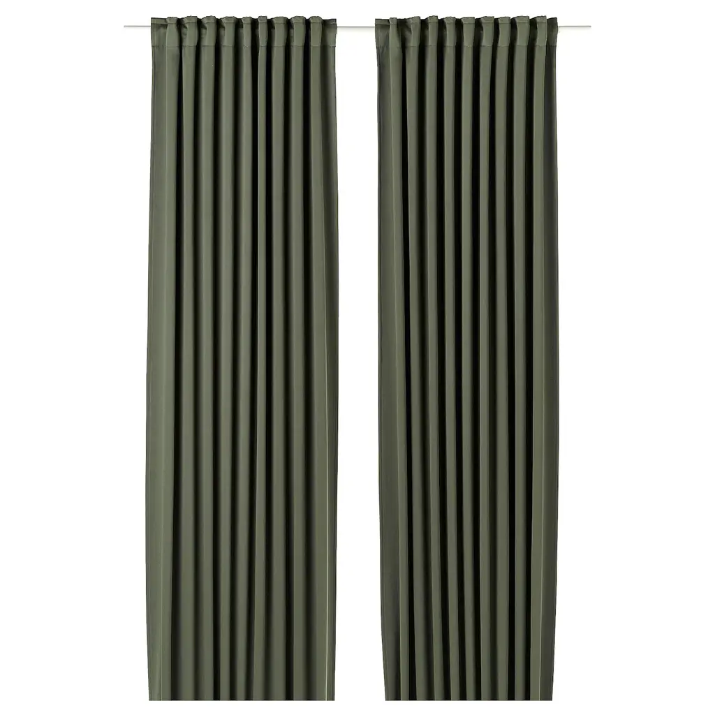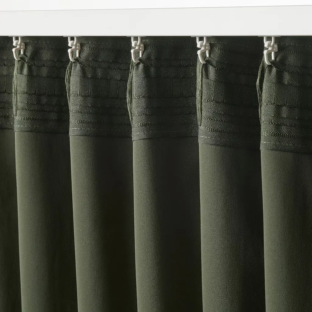 MAJGULL Black-out curtains, 1 pair - with heading tape/dark green 57x98 ". The fabric blocks out all light and glare on TV/screens. It gives complete privacy as shapes or light cannot be perceived from outside and the transition between day/night cannot be distinguished Curtains, 1 pair included