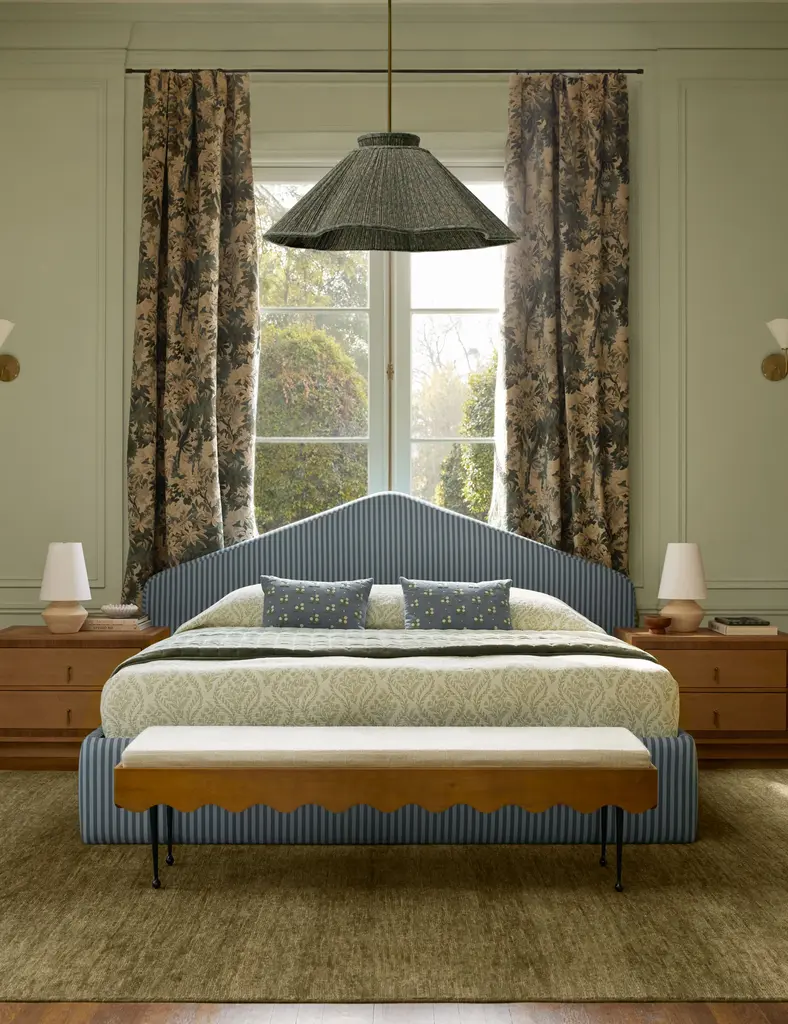 The Mariata curtain panel showcases a rich botanical tapestry that blends traditional artistry with a modern design. The panel offers versatile hanging options for a relaxed, gathered look or uniform folds. The cotton lining gently filters natural light to a soft, diffused glow.