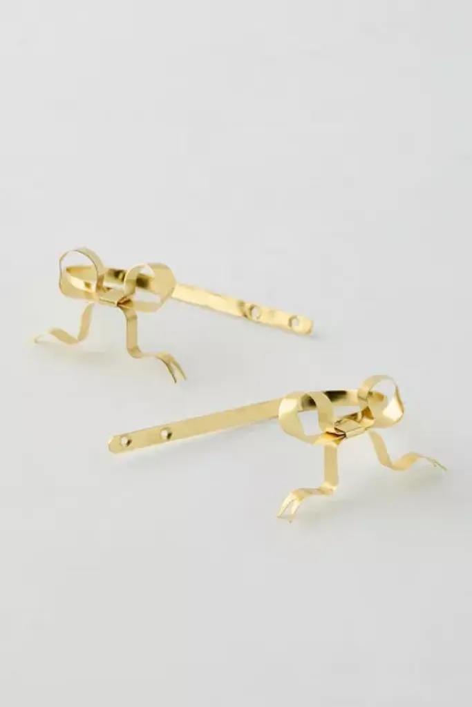The bow on top of your essential hardware, these curtain tie-backs feature flowing bows accenting the edge of the hooks. Available exclusively at Urban Outfitters. **Features** \- Marina Bow Curtain Tie-Backs from UO Home \- Finished with bow accents for a femme take on your essential hardware \- Wall mount capable \- UO exclusive **Content + Care** \- Includes 2 curtain tie-backs \- Mounts to wall - hardware not included \- Iron \- Wipe clean \- Imported **Size** \- Dimensions: 5.9"l x 3.5"w x 2.4"h