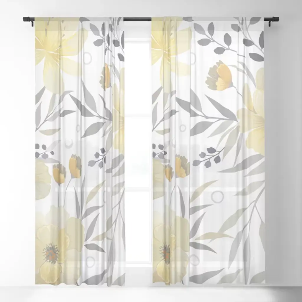 Modern, Floral Prints, Yellow, Gray And White Curtain