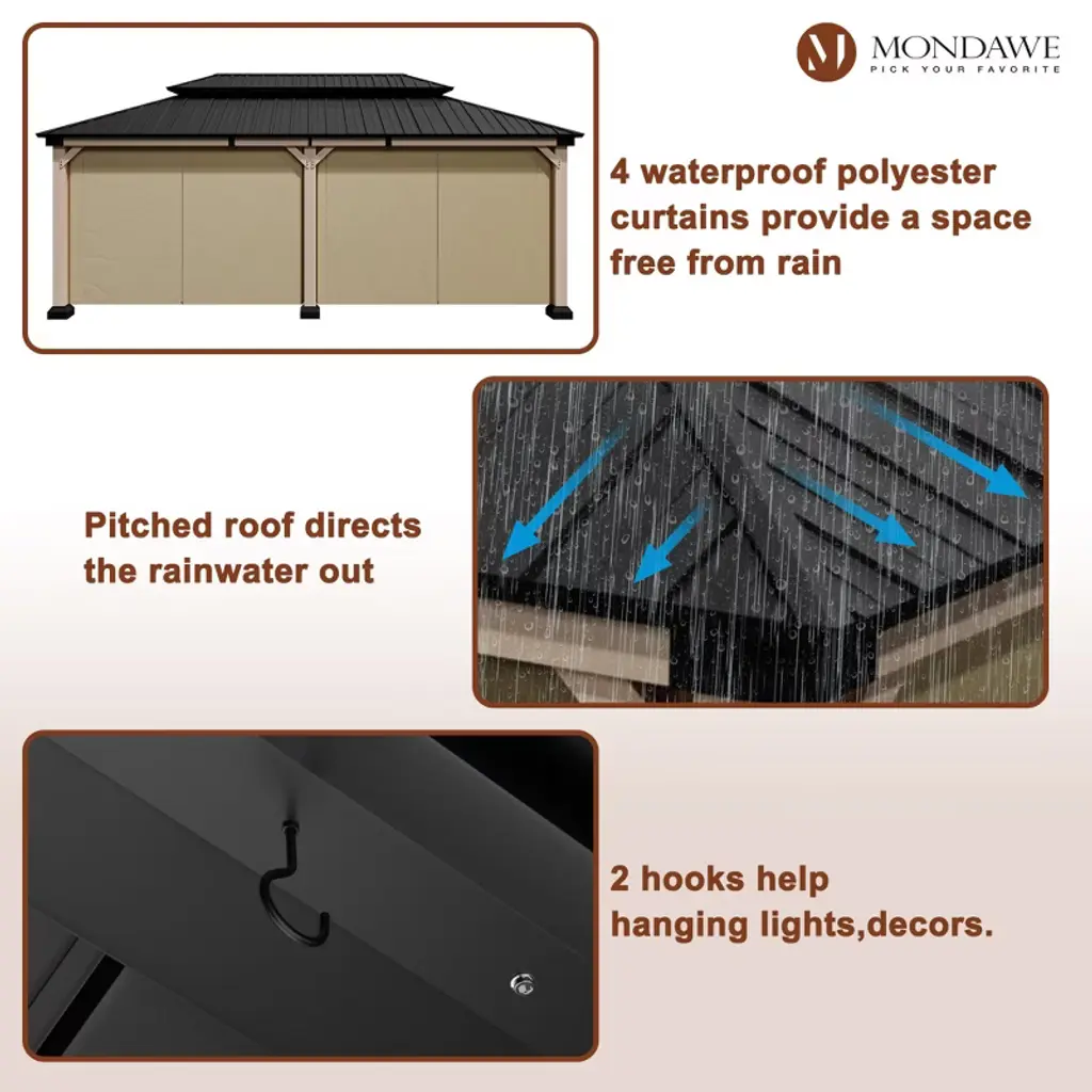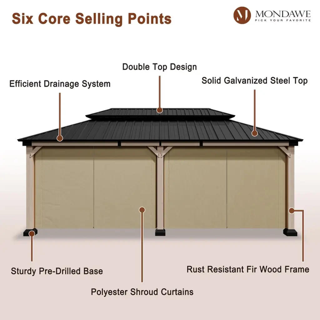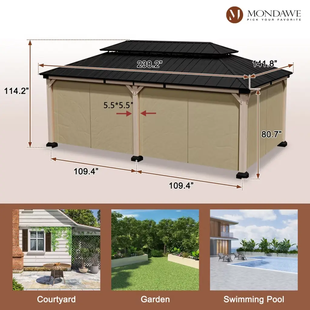 Mondawe 12x20ft. Outdoor Solid Wood Frame Patio Gazebo Galvanized Steel Hardtop With Curtain