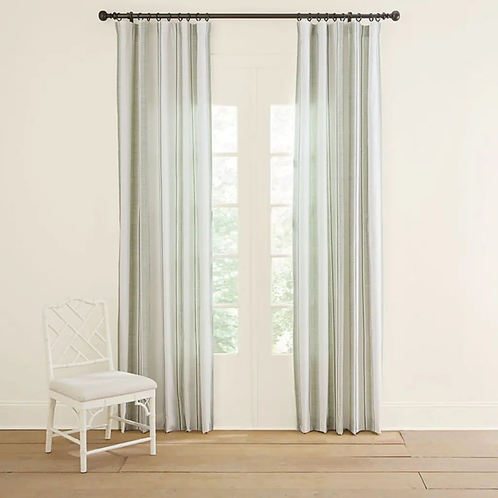 Our Murphy Striped Drapery Panel reimagines the graphic stripe with organic, visual texture and sophisticated details. This fresh window treatment is made of white cotton-linen blend and crisply printed in a light green, fern leaf stripe framed with dark green, rick-rack details. Murphy Striped Drapery Panel features: