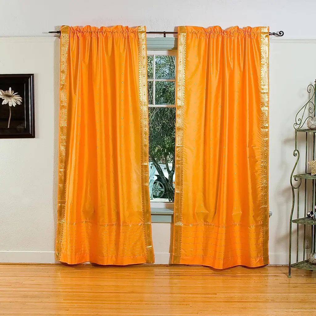 Add splendor to any room in your home with these Tab Top sari sheer curtains from India. These handmade drapes are heavily bordered with excellent artwork Sari Curtains / Drapes / Panels are the perfect choice for those looking for light, elegant drapes with a touch of luxury. It has smooth finish with a soft sheen and feels gentle and cool to the touch. Sheer curtains made of saris allow light in through windows but prevent people looking in when they are drawn. Story Behind the Art: The fabric of these curtains are weaved on a hand-loom in a small rural village in India and then hand-dyed. The artisans are a group of young hand-crafters who have moved from small villages to a big town in Central India and make various home decor items out of these exotic sari fabrics. This gives these wonderful artisans a way to have sustainable income via selling to the worldwide market on the internet. Your purchase supports local and home-based work where the artisans can easily tend to their families and pass these time-honored skills from one generation to the next.