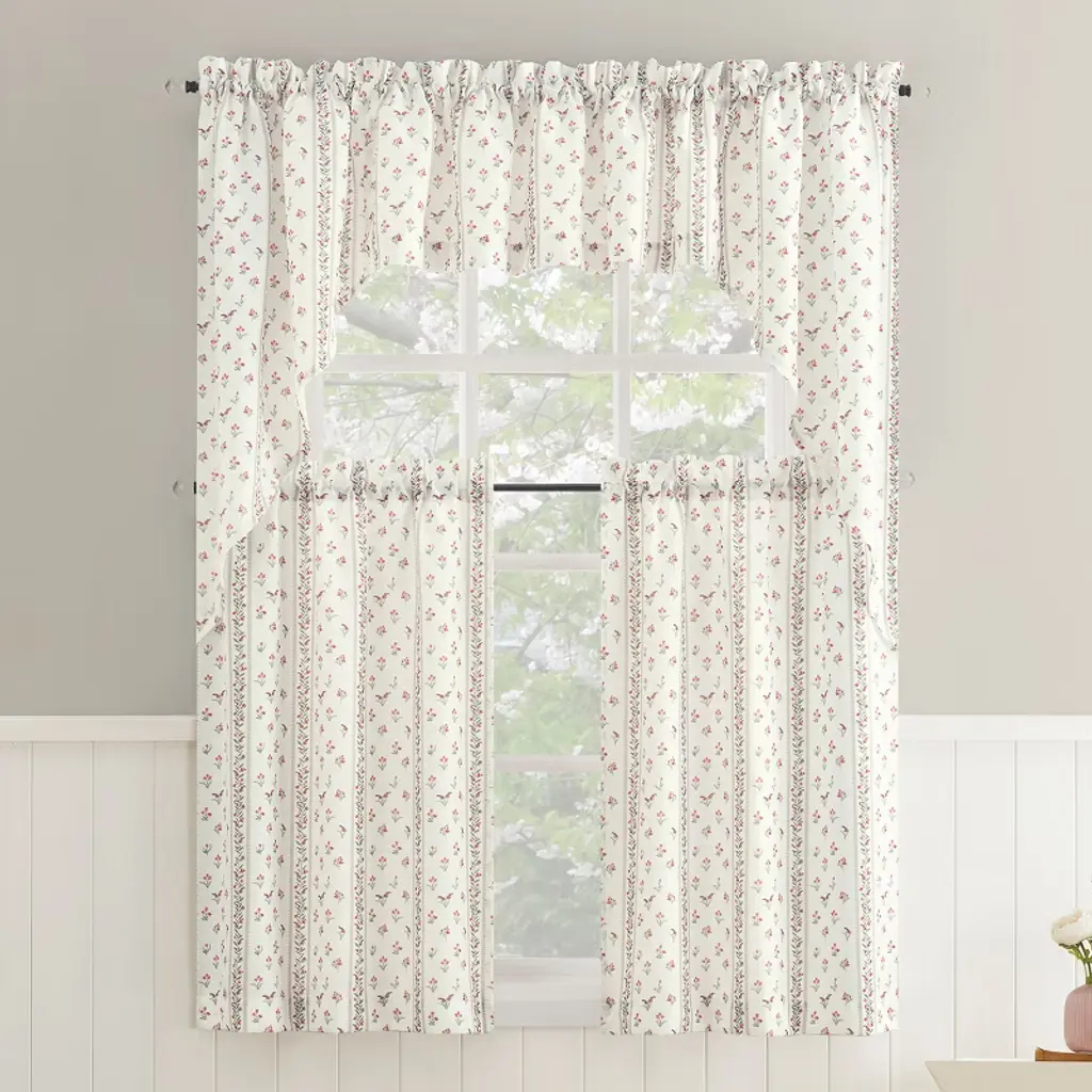 Add botanical charm to your kitchen or other small windows with the floral stripe printed design of Riverwood Kitchen Curtain Swag Pairs by No. 918. Gently filters light while enhancing privacy. Rod pocket design allows for easy hanging on a standard curtain rod up to 0.75" in diameter. Machine washable. Ideal layering piece for added privacy and light control. Swag pair includes two (2) swag valances Set includes two ivory swags measuring 54" width by 38" length in color ivory. Coordinating valances or tier pairs are sold separately. Measure carefully before selecting your desired size. Rod not included. Machine wash cold on gentle cycle. Use only non-chlorine bleach when needed. Tumble dry on low heat, using a cool iron as needed.