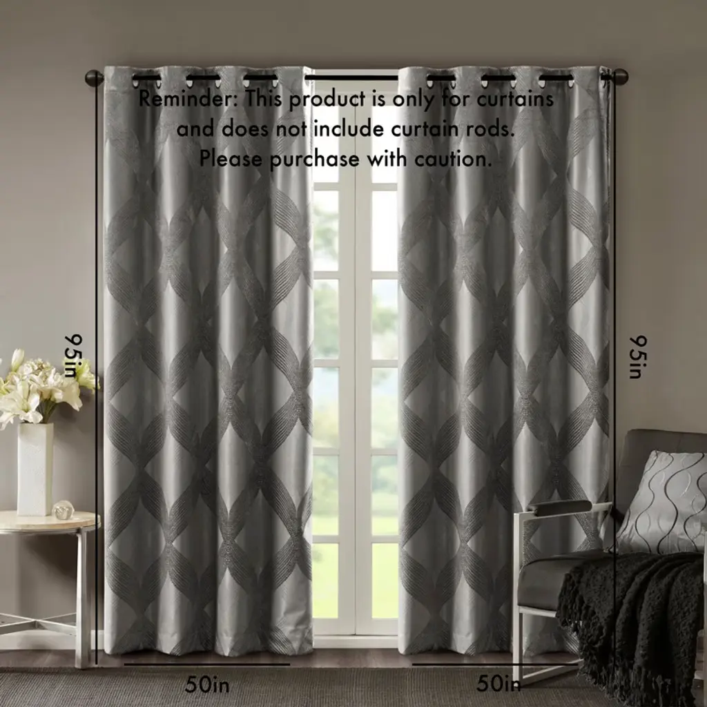 Description Combining luxe style with functionality, our SunSmart Bentley Ogee Knitted Jacquard Total Blackout Panel is the perfect update to dress any window. An ogee knitted jacquard design is featured in a rich charcoal hue, creating a luxurious sheen and texture. The heavy fabric uses a foamback and bonding finish enhancing the panel to block out all sunlight, provide a maximum protective barrier against noise intrusion, and offer a maximum level of privacy and energy savings. A silver grommet top finish makes it easy to hang, open, and close panels throughout the day; fits up to a 1.25” diameter rod. With 100% total blackout properties, this window panel is the perfect addition for bedrooms, media rooms, or any private spaces, giving your home a lavish and contemporary appeal. Lighting level: Pitch Black Ambiance. Product Details 50x95" 1 Window Panel:50"W x 95"L Material 100% Polyester