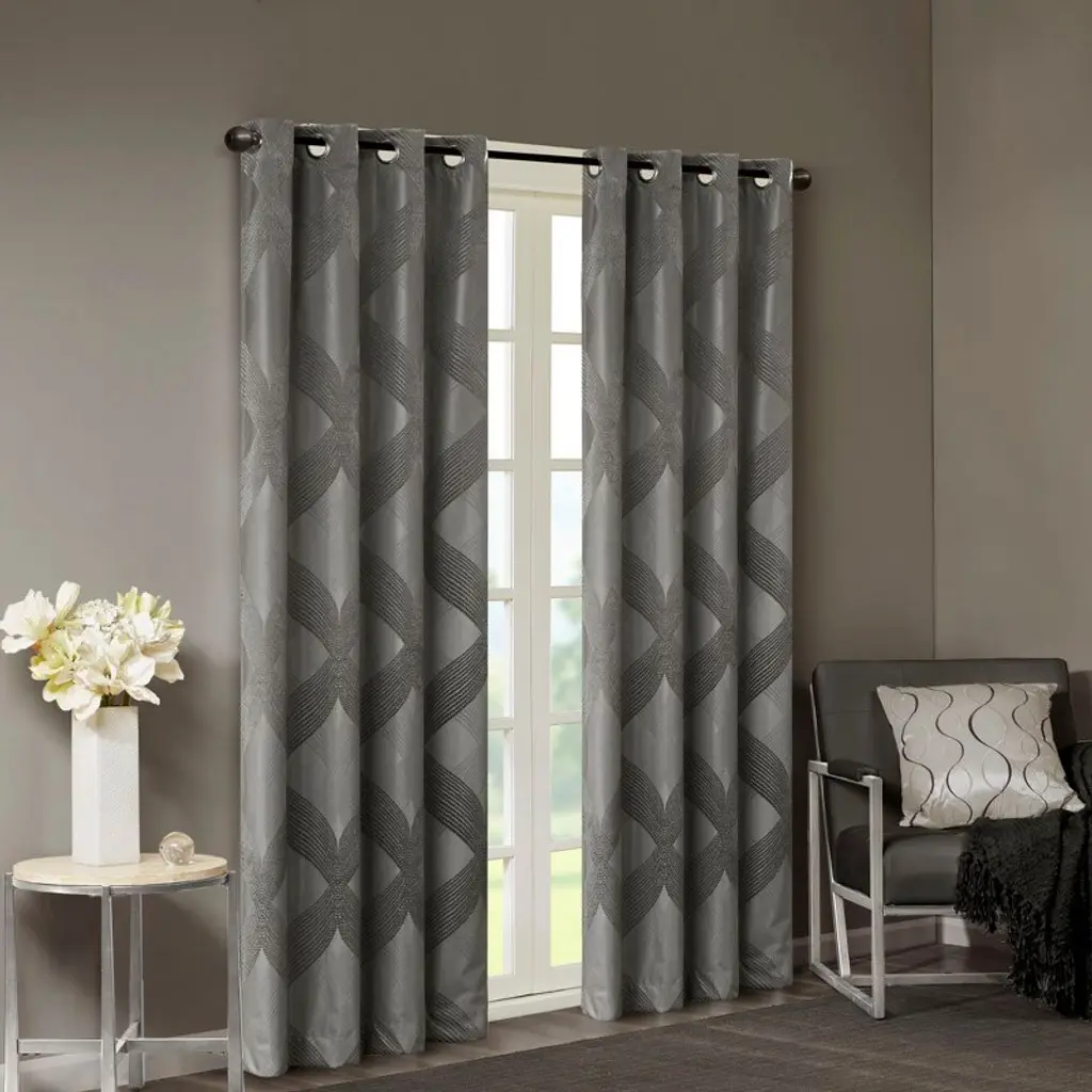 Description Combining luxe style with functionality, our SunSmart Bentley Ogee Knitted Jacquard Total Blackout Panel is the perfect update to dress any window. An ogee knitted jacquard design is featured in a rich charcoal hue, creating a luxurious sheen and texture. The heavy fabric uses a foamback and bonding finish enhancing the panel to block out all sunlight, provide a maximum protective barrier against noise intrusion, and offer a maximum level of privacy and energy savings. A silver grommet top finish makes it easy to hang, open, and close panels throughout the day; fits up to a 1.25” diameter rod. With 100% total blackout properties, this window panel is the perfect addition for bedrooms, media rooms, or any private spaces, giving your home a lavish and contemporary appeal. Lighting level: Pitch Black Ambiance. Product Details 50x108" 1 Window Panel:50"W x 108"L Material 100% Polyester