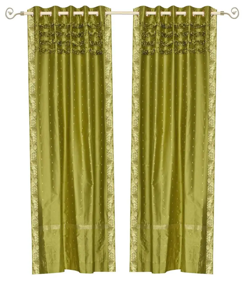 Olive Green Handcrafted Grommet Sheer Sari Curtain Drape Panel-Piece