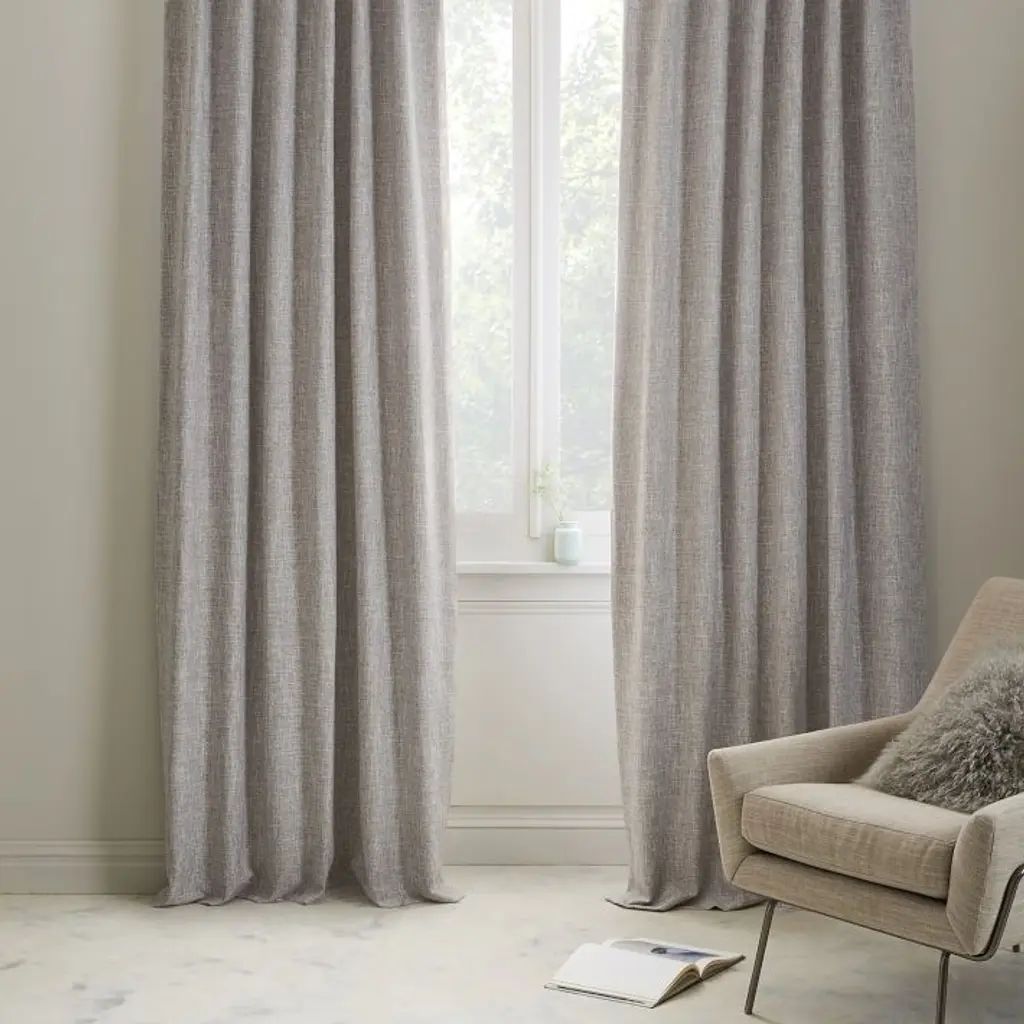 Created using interwoven threads, our Crossweave Curtain’s heathered fabric is an easy way to bring a subtle, textured touch to walls and windows. It's lined with a thick blackout layer that darkens rooms and reduces sound. Curtain: 100% polyester in Stone White. Blackout liner: 100% polyester. Various lengths, all sizes 48"w. Blackout liner is sewn in. Blackout lining blocks all light (great for nurseries and bright bedrooms). Dual pole pocket/hidden tab top treatment. Coordinates with west elm window hardware (sold separately). Sold individually. Imported.