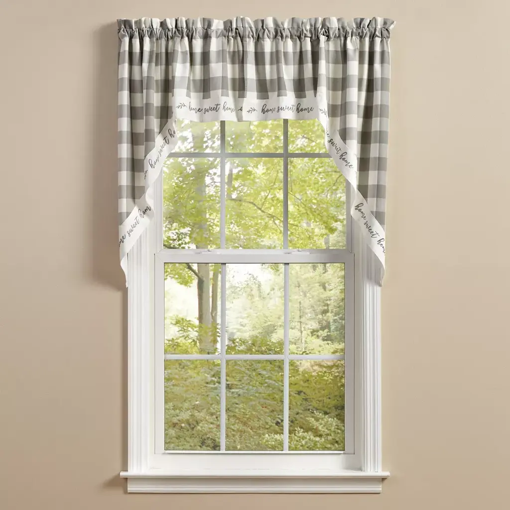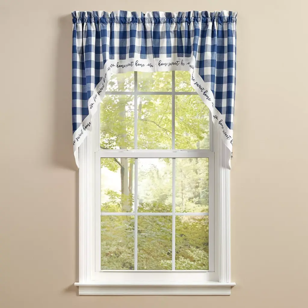 Uplift your living space with the beautiful blues and farmhouse fresh design by introducing this country patterned valance curtain. This lined window accessory features a timeless blue and white check pattern with a beautiful 'home sweet home' bottom border. Add this beautiful lined window treatment to your dining room or kitchen space to invite a fresh look without having to redecorate the entire room.