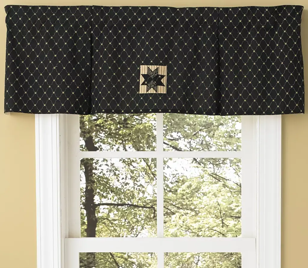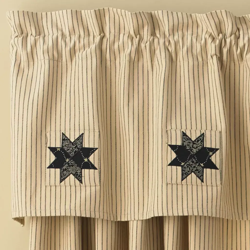 This farmhouse fresh pattern displays a classic design with neutral hues. The country valance curtain features a stripe design with timeless fabrics stitched into traditional primitive star patches. Delicately frames a window space and softens outdoor lighting to create a comfortable, cozy ambiance. Whether placed in the kitchen, living room, bedroom, or beyond, this patterned valance adds a touch of farmhouse flair to any interior. The natural ruffling of the fabric at the top paired with its chic design will create a stylish look without having to redecorate an entire room. To care for this window treatment, it is recommended to dry clean.