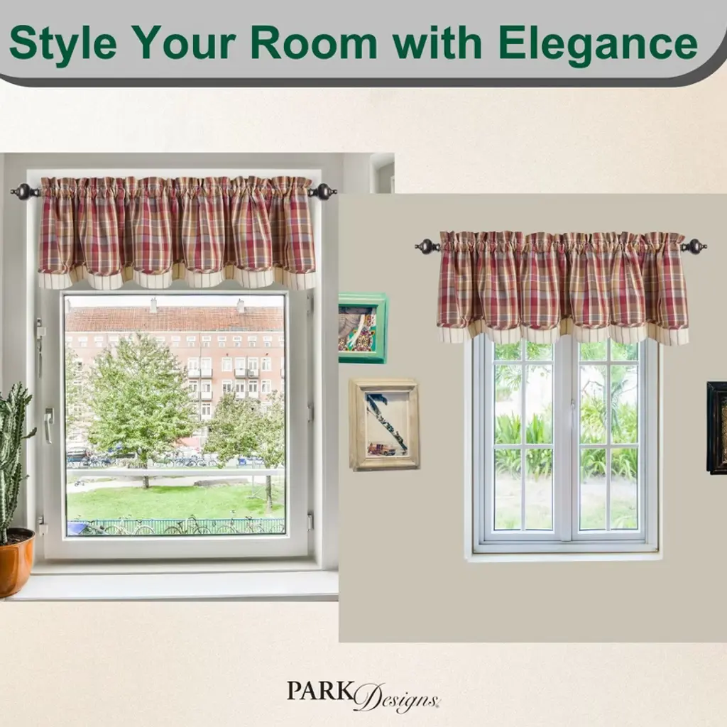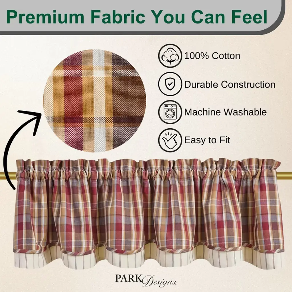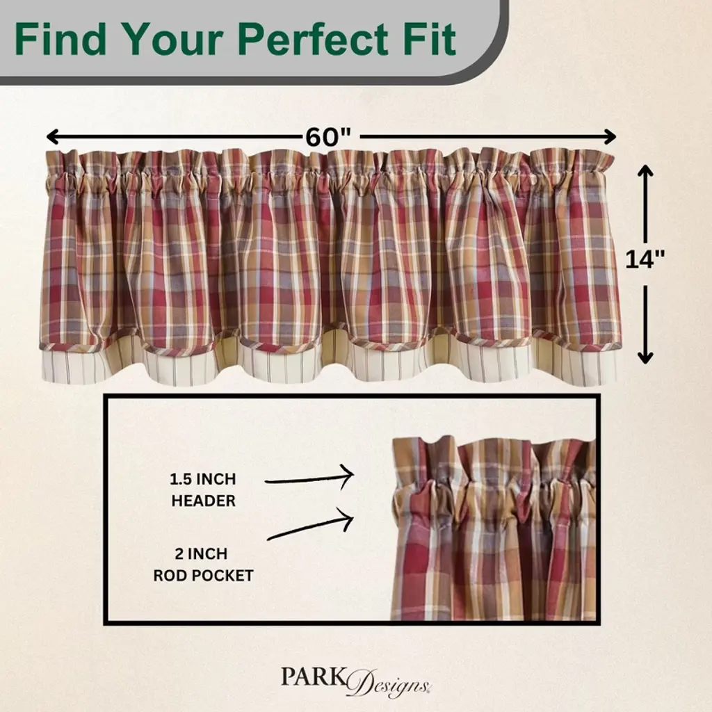 Grace your space with a touch of traditional charm! This layered pattern valance curtain has a classic plaid and stripe tiered design that elegantly incorporates a country color palette in rustic red, honey yellow, brown, and cream hues. The lined element softens outdoor lighting for a comfortable, cozy ambiance. Offers a timeless look without having to redecorate an entire room that can be used by itself or paired with your favorite tier or curtain panel for a dynamic display. This window treatment can be used time and time again in your favorite farmhouse, country chic, fall, summer, and primitive room decor.
