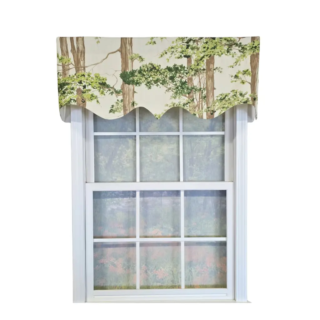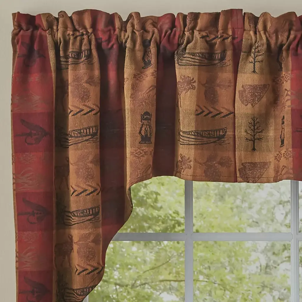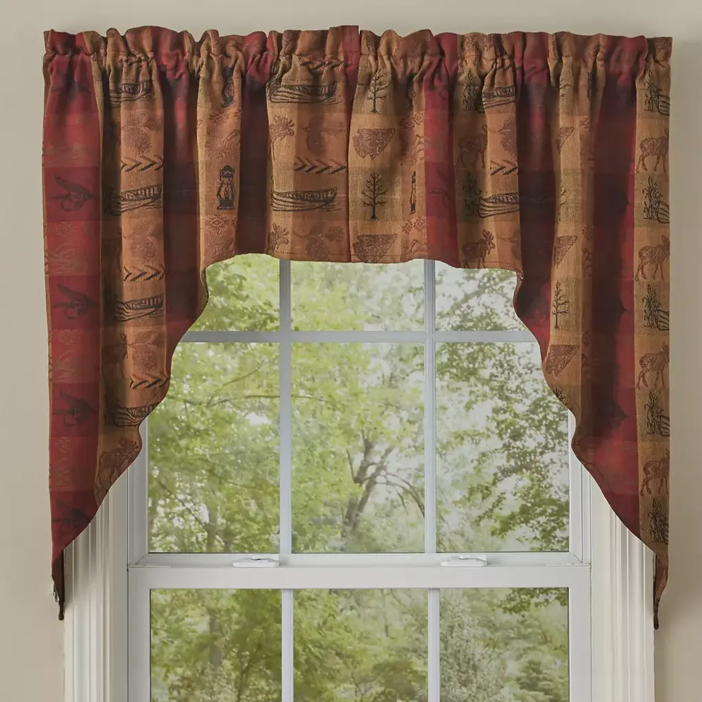 This rustic swag curtain features a lovely herringbone plaid in warm tones of red, mustard, chocolate & black. Woven into the plaid design are images of moose, bears, pine trees, canoes, arrowheads & other symbols of the great outdoors. This unique jacquard pattern is perfect for your rustic, lodge, farmhouse or primitive decor.