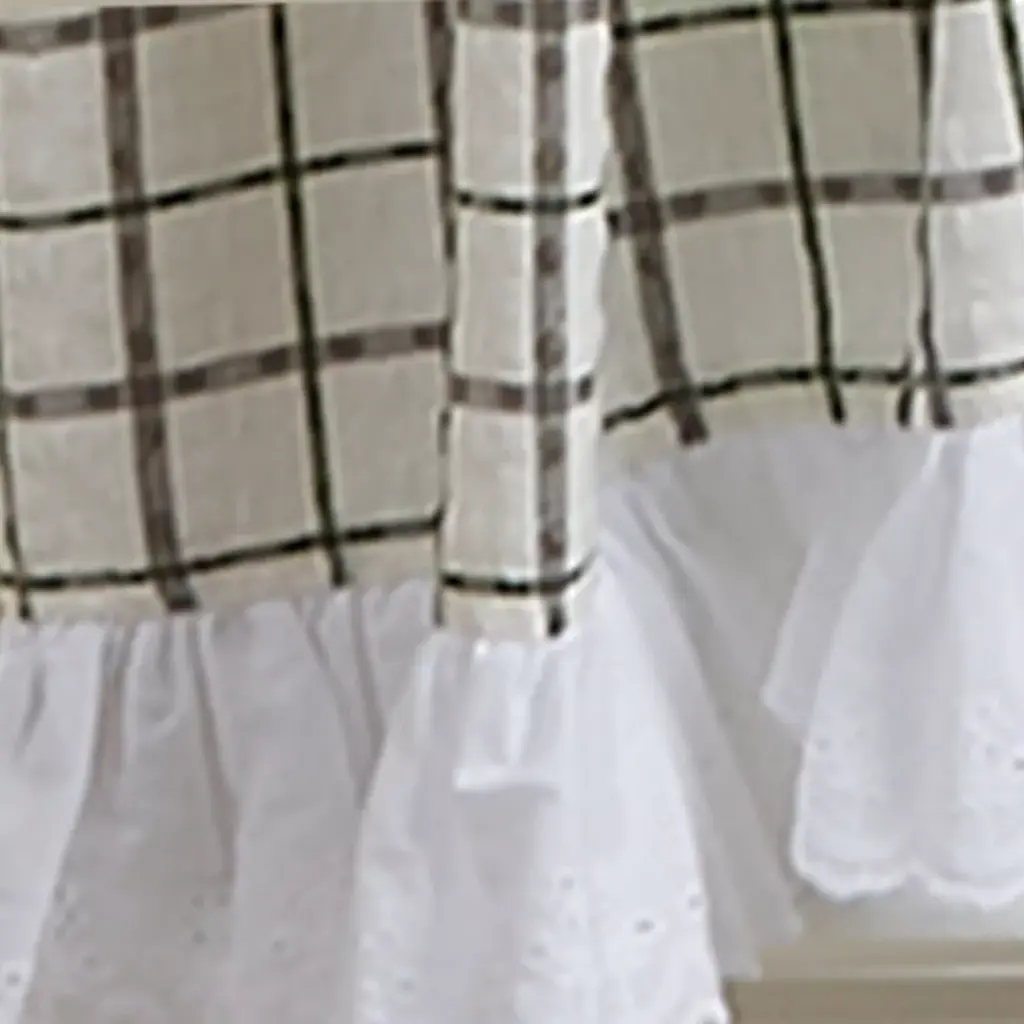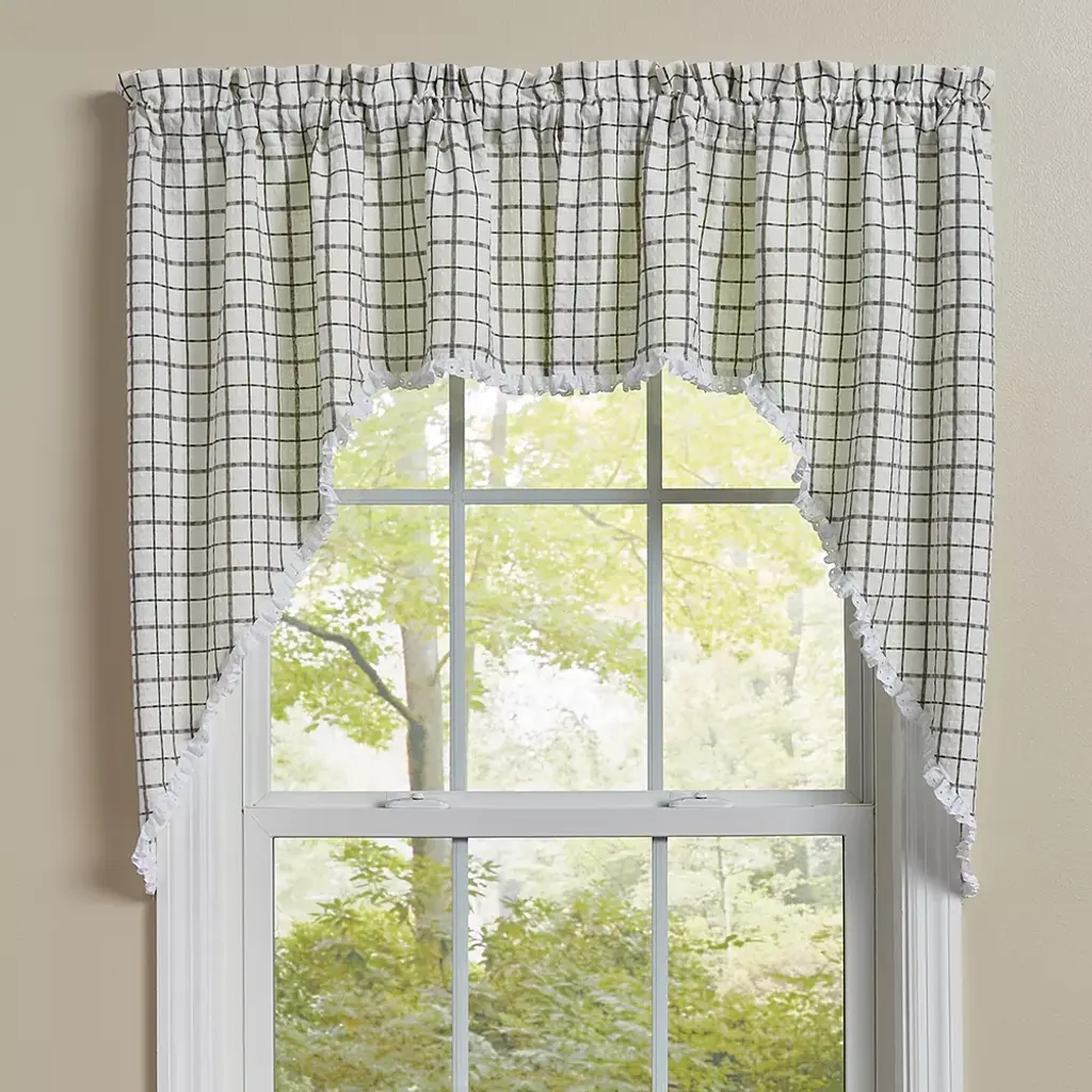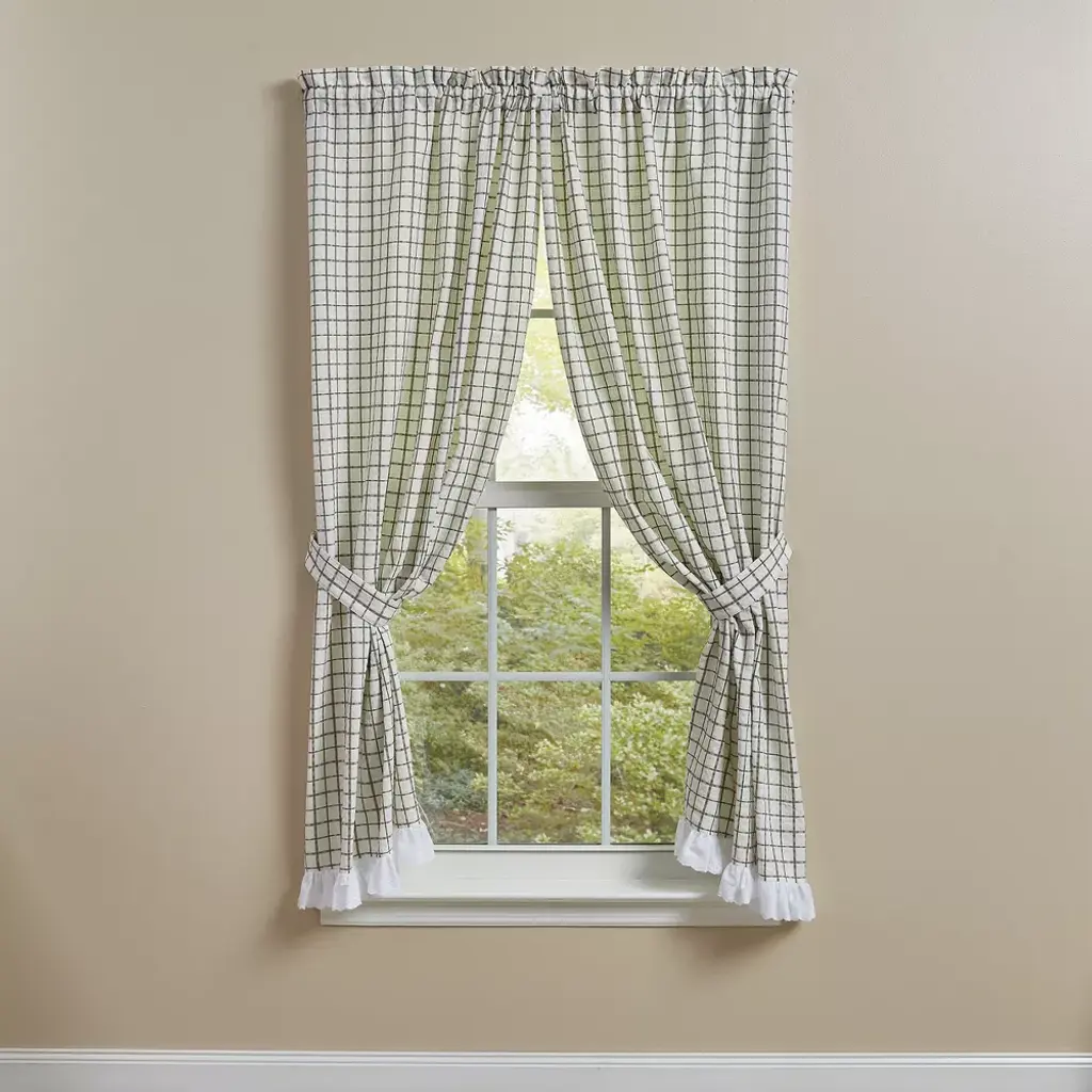 Add stylish elegance to any room in the home with this pretty panel pair that include a coordinating set of tiebacks. The panels create a warm and inviting statement for your window, and you will quickly fall in love with the classic appeal this window treatment adds to your home decor with its timeless design. The natural ruffling of the fabric at the top paired with its simple check print will create a lovely, country update without having to redecorate an entire room.