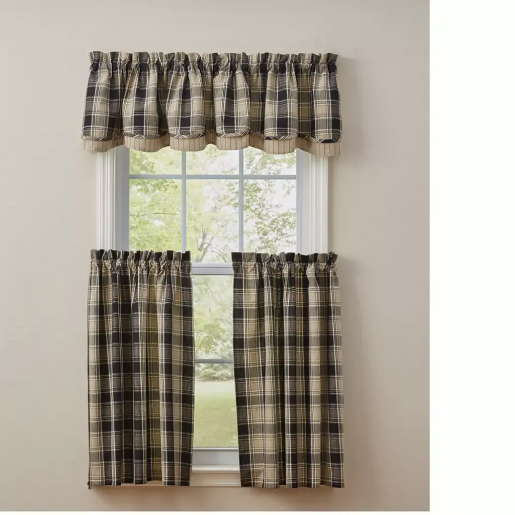 The soapstone plaid in rich black, tan and cream is a large soft design with pretty ticking underlayer. Whether your decor is country, farmhouse or cottage, the Soapstone valance will enhance and freshen your home beautifully without having to redecorate an entire room. The quality and graceful lines add a custom look at a great price.