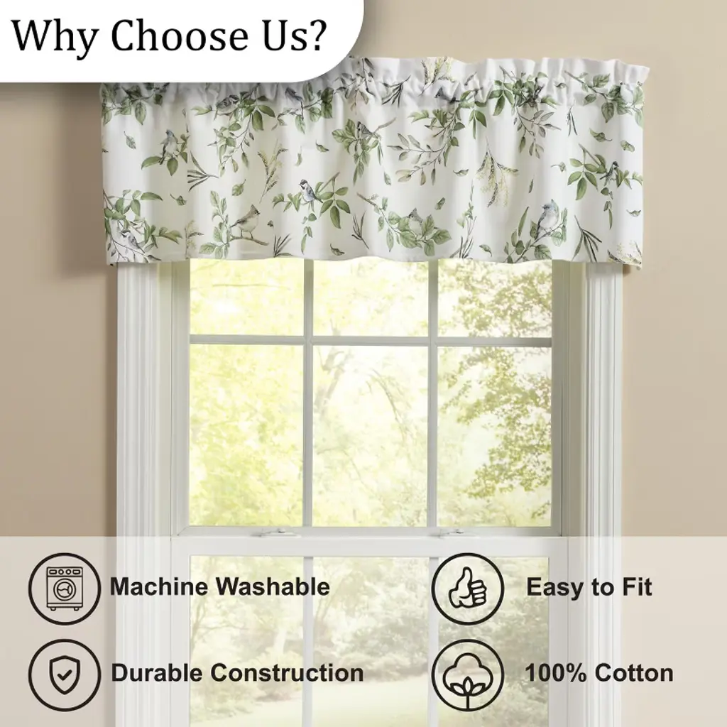Delightful botanical blooms refresh any room setting with a sensation of energy and beauty, bringing a relaxed element from its earthy color palette and nature inspired design. Elegant branches and leaves are occupied by adorable songbirds to delicately frame a window space. The lined element softens outdoor lighting for a comfortable, cozy ambiance. Whether placed in the kitchen, living room, bedroom, or beyond, this patterned valance adds a touch of floral flair to any interior. The natural ruffling of the fabric at the top paired with its chic design will create a stylish look without having to redecorate an entire room.