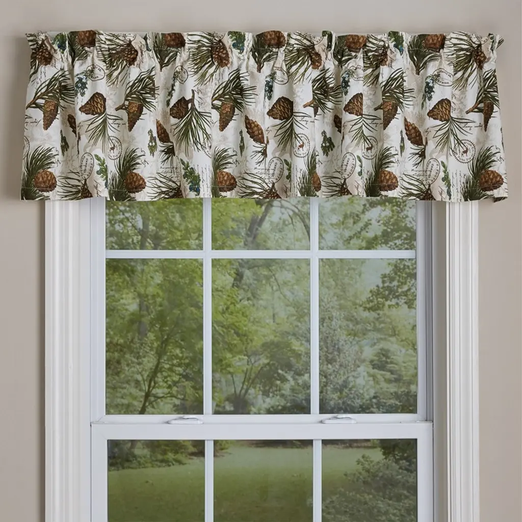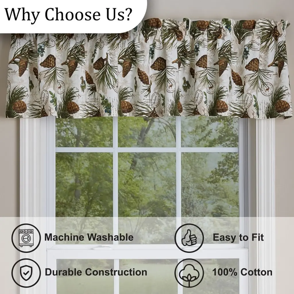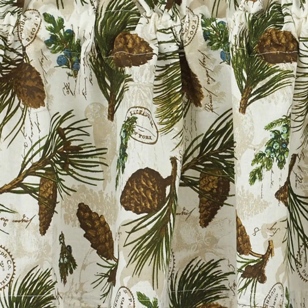This outdoorsy valance curtain is a gorgeous addition to any country farmhouse or lodge cabin decor! We collaborated with artist Tina Higgins to create the beautiful Walk In The Woods Collection. It combines pine boughs with a sepia toned background of woodland elements and vintage stamp accents to create a striking textile and ceramic collection.