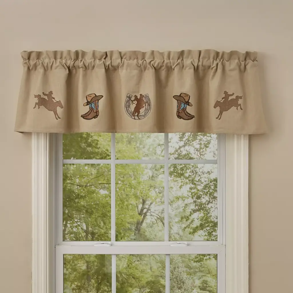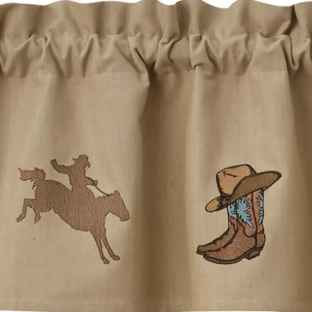 Add a bit of Western charm to your country home decor with this embroidered valance curtain. Stitched with incredible attention to detail of cowboy boots, rodeo horse designs, and more fun embroidered patterns that will subtly amplify your Western wall decor. Hang this in a bedroom, kitchen or living space where you'd enjoy a flood of natural, warm light. This beige ruffled window treatment will pair well with many home decor styles, including ranch, farmhouse, country or primitive.
