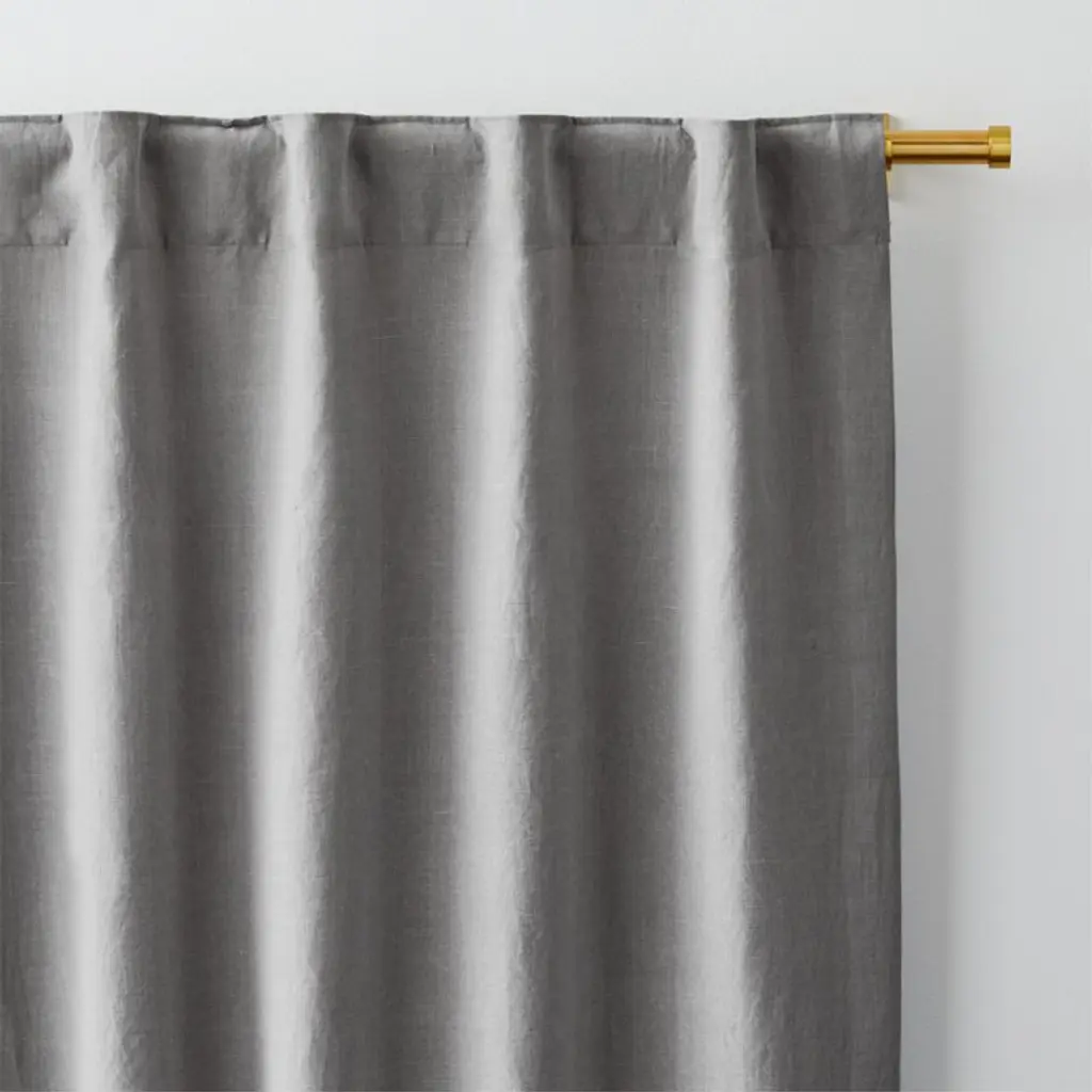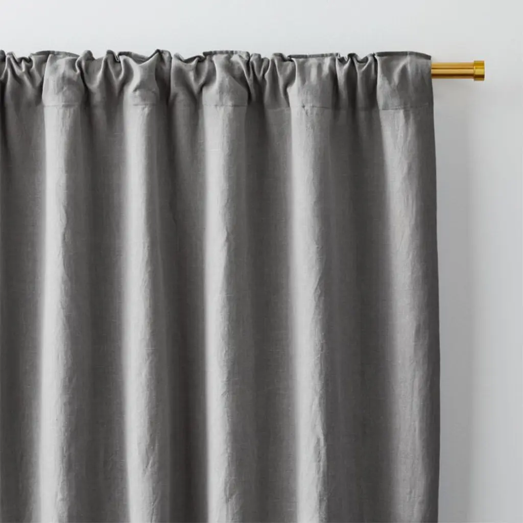 Sustainable linen weaves a luxurious blackout curtain in stoney grey. Washed for enhanced softness, the curtain panel drapes beautifully while blocking unwanted illumination from outdoors. Hang our exclusive linen curtain with blackout liner from the back tabs for an elegant pleated style, use the rod pocket to create a more laid-back gathered look or add a set of our curtain clips (sold separately).Curtain hardware also available.Learn how to hang curtains in our guide.