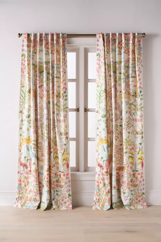 The traditional flora and fauna motif on our curtain dresses up the room with warm color. Made from a linen-cotton blend for soft texture, it features a blackout liner that effectively darkens the room – perfect for an afternoon nap or a movie night during the day.