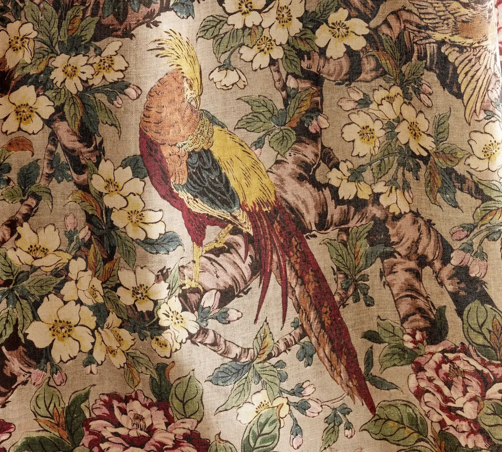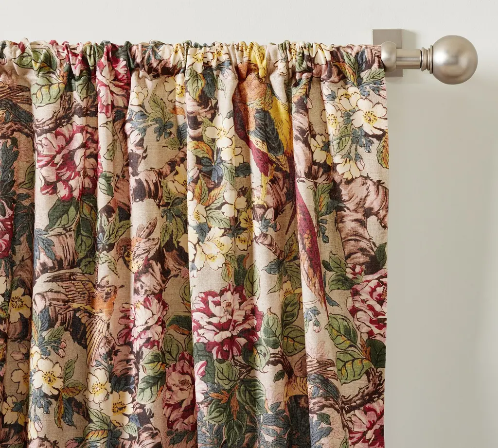 The traditional flora and fauna motif on our curtain dresses up the room with warm color. Made from a linen-cotton blend for soft texture, it features a blackout liner that effectively darkens the room – perfect for an afternoon nap or a movie night during the day.
