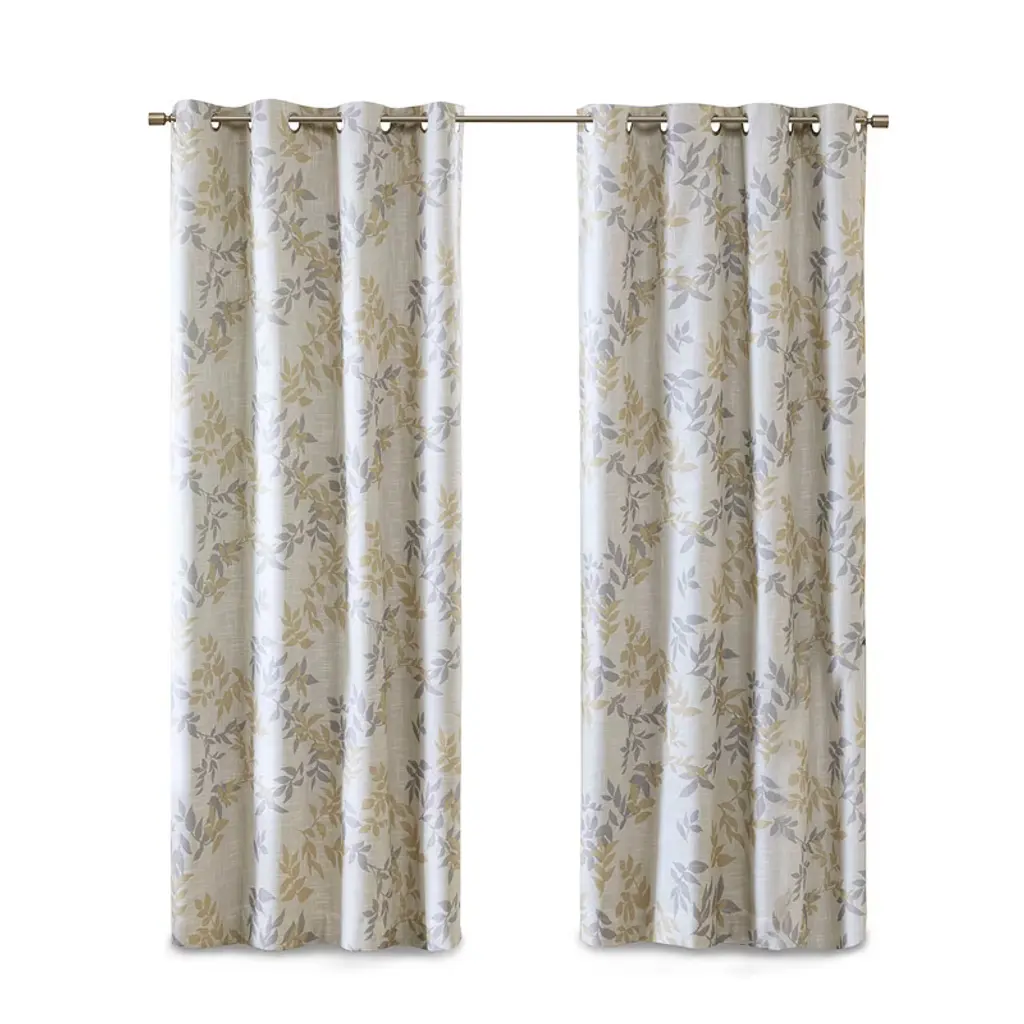 Description With a fun fresh take on energy efficiency, our SunSmart Julie Printed Botanical Blackout Panel is the perfect update to liven up any room. Featuring an updated botanical design printed in yellow and grey hues, this blackout window panel is made from a textured polyester slub base fabric creating texture and dimension for a casual look. A one pass foamback finish with additional bonding on the reverse enhances the panel to buffer most sunlight, while also creating a significant barrier to reduce outside noise. Silver grommet top finish makes this panel easy to hang, open, and close throughout the day; while fitting up to a standard 1.25¡± diameter rod. Perfect for home offices, family rooms, and bedrooms, this blackout panel provides a high-level of privacy and considerable energy savings in a trend-setting style. Lighting level: Heavily Shaded Ambiance. Product Details 50x95" 1 Window Panel:50"W x 95"L Material 100% Polyester Slub
