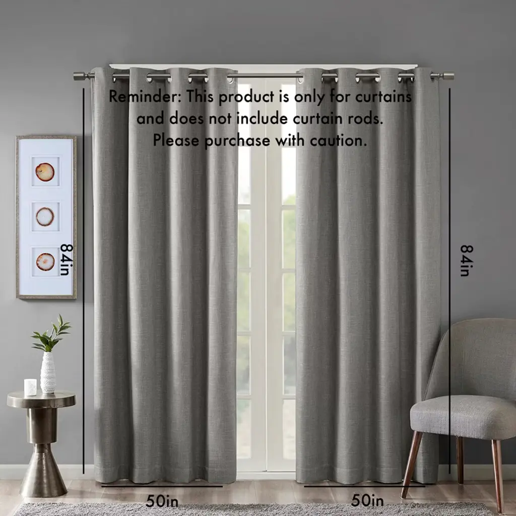Description Energy efficiency meets chic casual style, with our SunSmart Maya Printed Heathered Blackout Panel. Featuring a printed heathered design in a cool grey hue, this blackout window panel is made from a textured polyester slub base fabric creating beautiful texture and dimension. A one pass foamback finish with additional bonding is added and enhances the panel to buffer most sunlight, while also creating a significant barrier to reduce outside noise. The silver grommet top makes it easy to hang, open, and close the window panel throughout the day; fits up to a 1.25¡± diameter rod. Perfect for home offices, family rooms, and bedrooms - this blackout panel provides considerable energy savings and a high-level of privacy by bringing a heavily shaded lighting level to any room. Product Details 50x84in 1 Window Panel:50inW x 84inL Material 100% Polyester Slub