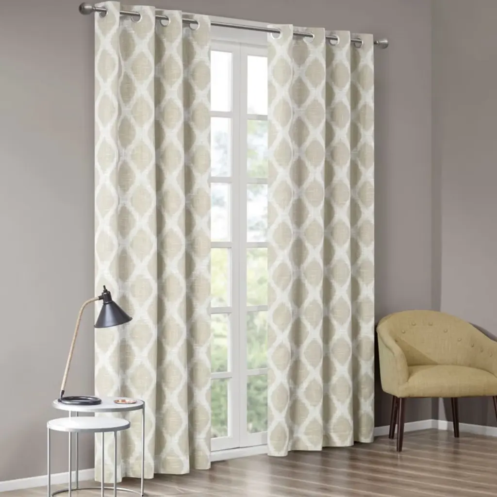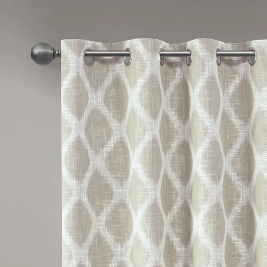 Introducing a modern and stylish take on energy efficiency, our SunSmart Blakesly Printed Ikat Blackout Panel is the perfect update to any room. Fresh and chic, this window panel features a printed taupe ikat design on a textured firm base fabric, creating dimension for a cool and casual look. Finished with a two pass foamback and bonding technique, the panel is enhanced to block most sunlight and create a significant barrier to reduce outside noise. Silver grommet top detail makes it easy to hang, open, and close panels throughout the day; while fitting up to a standard 1.25” diameter rod. With considerable energy savings and a high level of added privacy, this blackout panel is perfect for home offices, family rooms, and bedrooms. Give your space a beautiful, one-of-a-kind update with this contemporary blackout window panel. Lighting level: Heavily Shaded Ambiance. Product Details 50x84" 1 Window Panel:50"W x 84"L Material 100% Polyester Slub