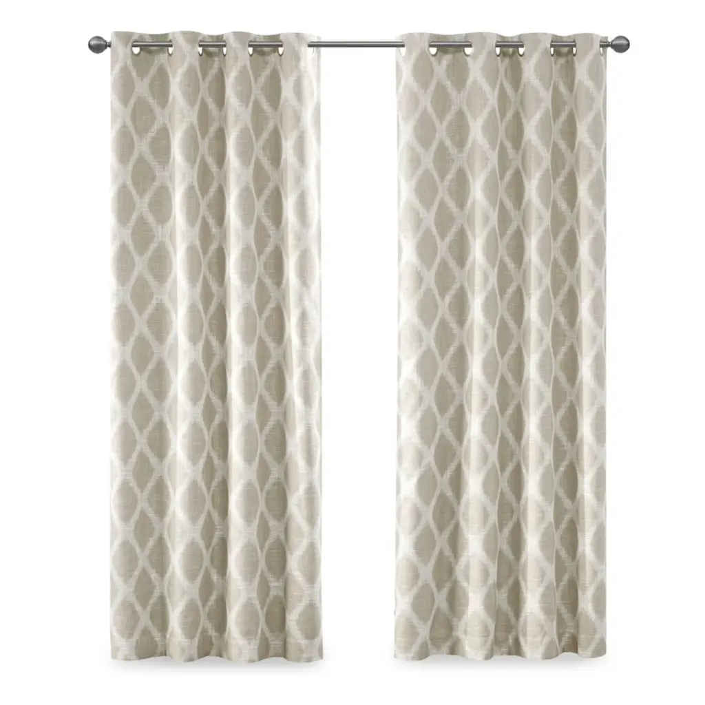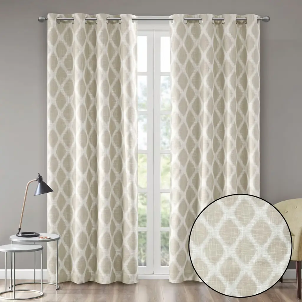 Description Introducing a modern and stylish take on energy efficiency, our SunSmart Blakesly Printed Ikat Blackout Panel is the perfect update to any room. Fresh and chic, this window panel features a printed taupe ikat design on a textured firm base fabric, creating dimension for a cool and casual look. Finished with a two pass foamback and bonding technique, the panel is enhanced to block most sunlight and create a significant barrier to reduce outside noise. Silver grommet top detail makes it easy to hang, open, and close panels throughout the day; while fitting up to a standard 1.25¡± diameter rod. With considerable energy savings and a high level of added privacy, this blackout panel is perfect for home offices, family rooms, and bedrooms. Give your space a beautiful, one-of-a-kind update with this contemporary blackout window panel. Lighting level: Heavily Shaded Ambiance. Product Details 50x95in 1 Window Panel:50inW x 95inL Material 100% Polyester Slub