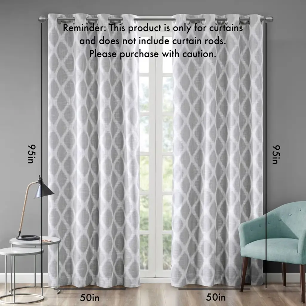 Introducing a modern and stylish take on energy efficiency, our SunSmart Blakesly Printed Ikat Blackout Panel is the perfect update to any room. Fresh and chic, this window panel features a printed grey ikat design on a textured firm base fabric, creating dimension for a cool and casual look. Finished with a two pass foamback and bonding technique, the panel is enhanced to block most sunlight and create a significant barrier to reduce outside noise. Silver grommet top detail makes it easy to hang, open, and close panels throughout the day; while fitting up to a standard 1.25” diameter rod. With considerable energy savings and a high level of added privacy, this blackout panel is perfect for home offices, family rooms, and bedrooms. Give your space a beautiful, one-of-a-kind update with this contemporary blackout window panel. Lighting level: Heavily Shaded Ambiance. Product Details 50x95" 1 Window Panel:50"W x 95"L Material 100% Polyester Slub
